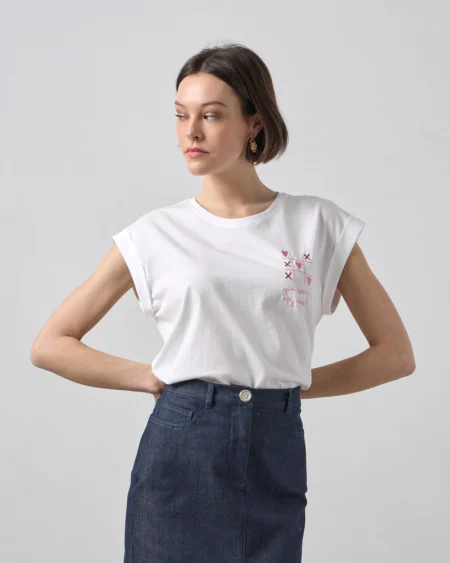Μπλούζα κοντομάνικη με στρογγυλή λαιμόκοψη, μανίκι με ρεβέρ, λεπτομέρεια κέντημα με καρδιές, σε βαμβακερό ύφασμα, σε κανονική γραμμή