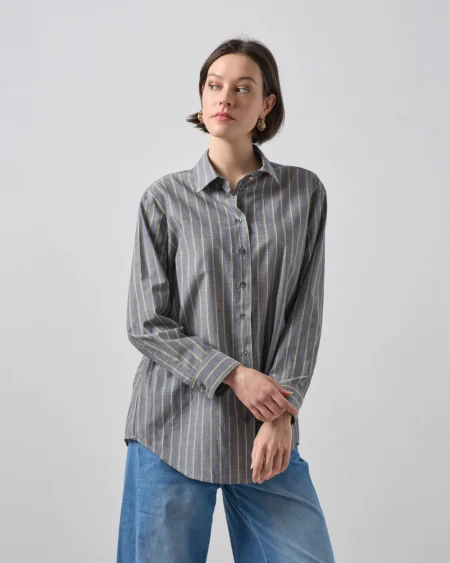 Μακρυμάνικο πουκάμισο σε γκρι-μπλε απόχρωση με λεπτή κάθετη ρίγα.Κατασκευασμένο από ελαφρύ ύφασμα που αναπνέει, προσφέρει δροσιά και κομψότητα από το πρωί στο νησί μέχρι τις απογευματινές βόλτες στην πόλη. Άνετη (relaxed fit) για απόλυτη ελευθερία κινήσεων, συνδυάζεται τέλεια με το αγαπημένο σας denim ή μια λευκή παντελόνα.