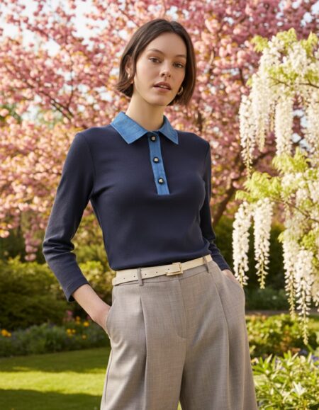 Η απόλυτη επιλογή για το “Quiet Luxury” look της άνοιξης.Αυτή η εκλεπτυσμένη πλεκτή μπλούζα σε διαχρονικό navy blue χρώμα, επαναπροσδιορίζει το κλασικό polo στυλ.Συνδυάζει την απαλή υφή ενός ποιοτικού λεπτού πλεκτού με τις μοντέρνες λεπτομέρειες από denim ύφασμα στον γιακά και την πατιλέτα, δημιουργώντας μια εντυπωσιακή αντίθεση που μαγνητίζει τα βλέμματα.