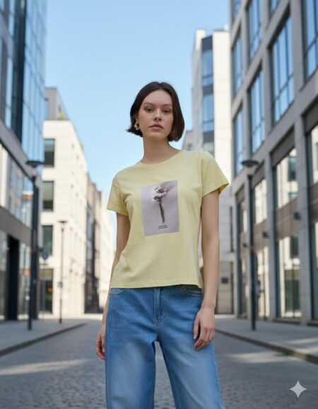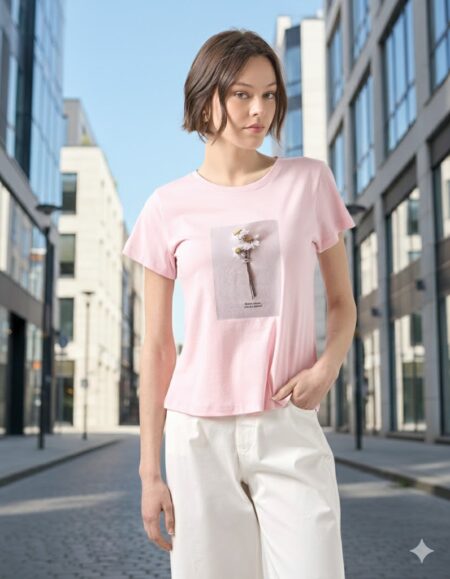Μπλούζα κοντομάνικη με στρογγυλή λαιμόκοψη, στάμπα με λουλούδι σε βαμβακερό ύφασμα, σε κανονική γραμμή