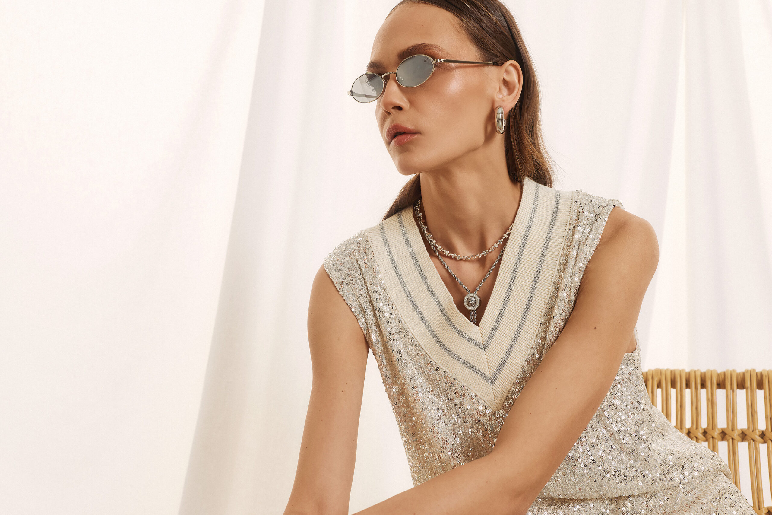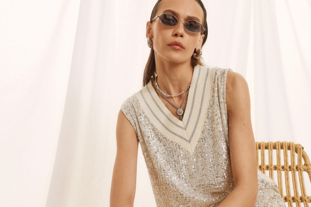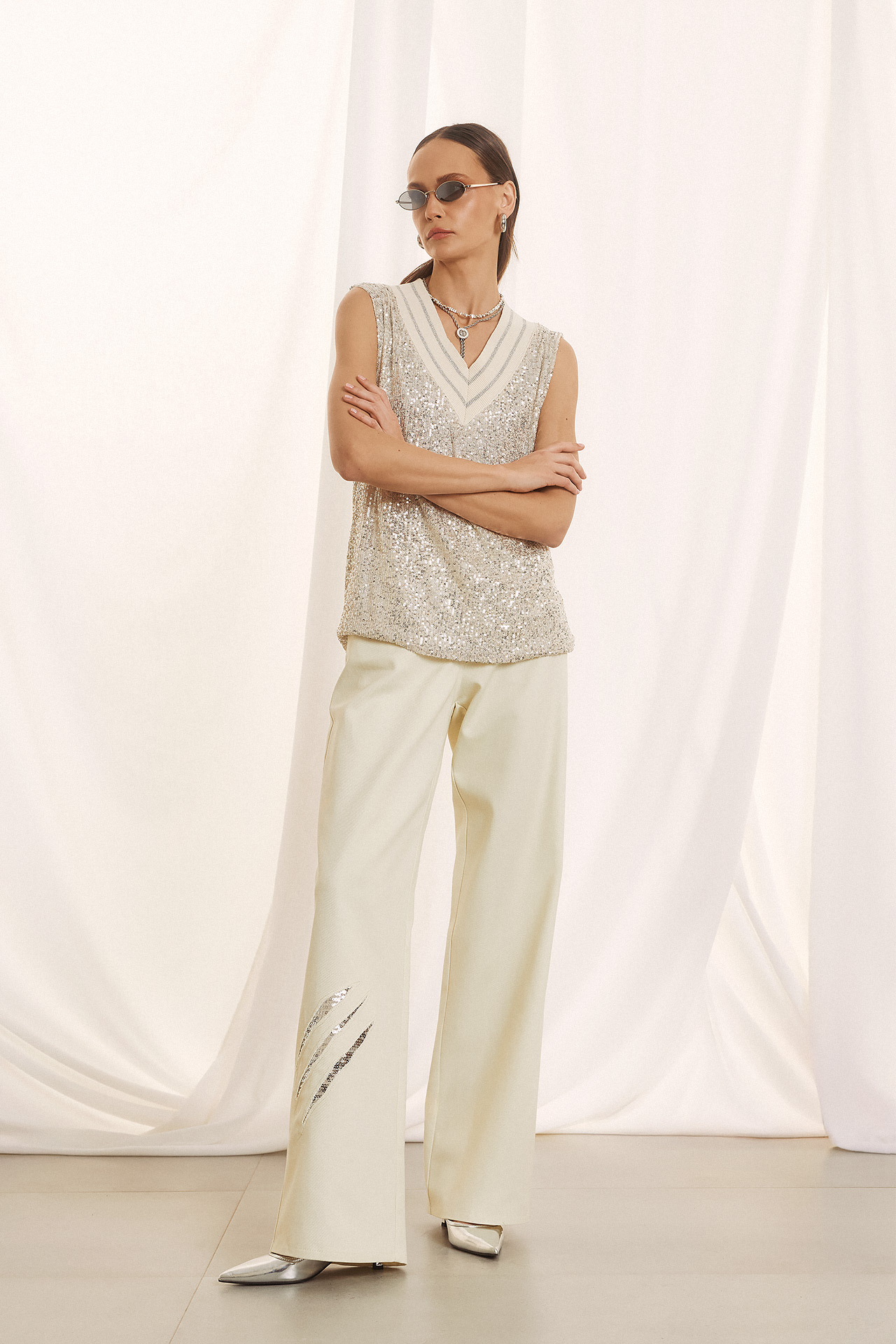 Η επιφάνειά του είναι καλυμμένη με shimmering παγιέτες σε σαμπανιζέ/ιβουάρ απόχρωση, προσφέροντας λάμψη που μαγνητίζει τα βλέμματα.Διαθέτει κομψή V λαιμόκοψη με ριμπ λεπτομέρεια και διακριτικές ρίγες, που παραπέμπει σε preppy style με ένα glam twist.