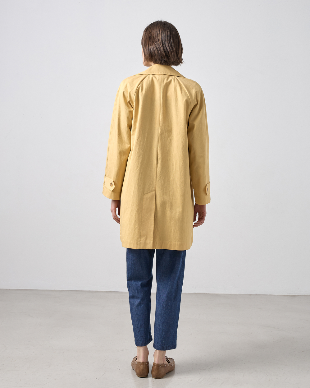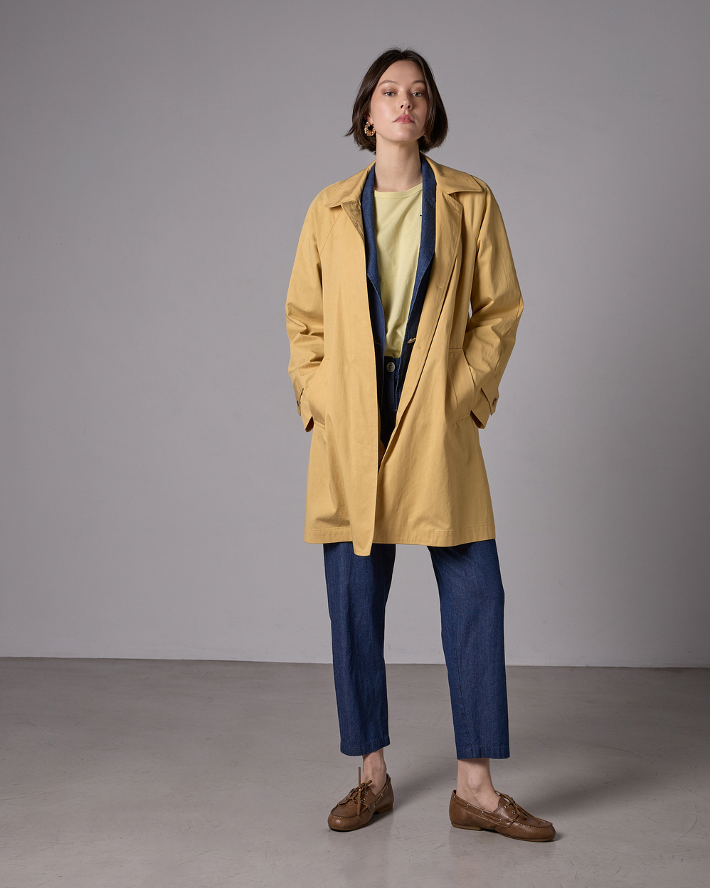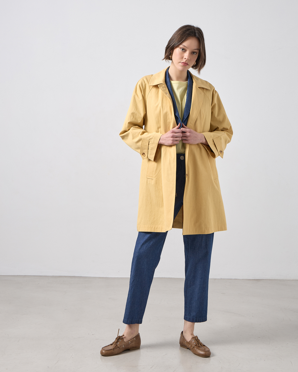 Καπαρντίνα σε ίσια γραμμή με κλασικό γιακά, κλείσιμο μπροστά με κουμπιά, πλαΐνές τσέπες, mid-length, σε άνετη γραμμή