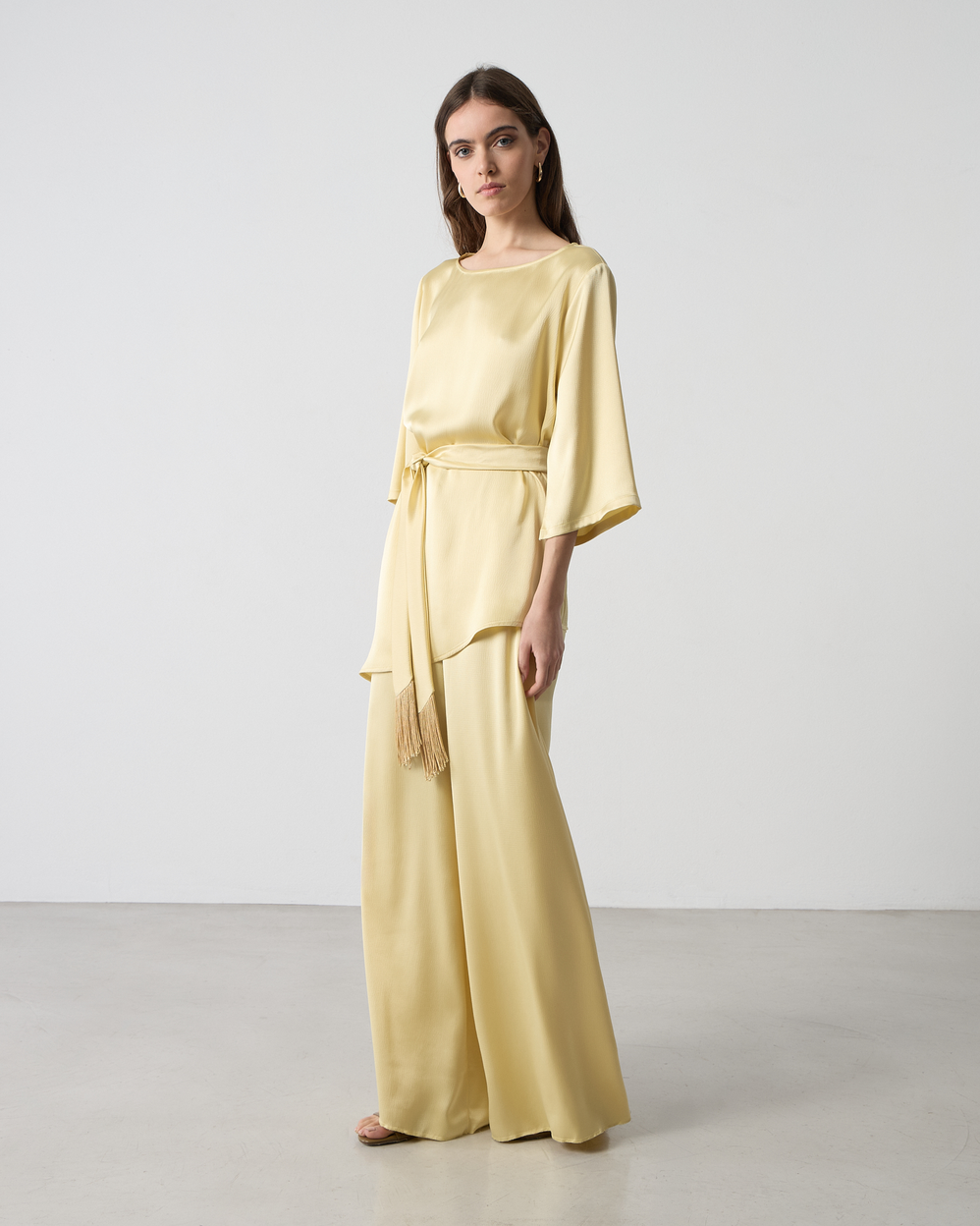 Μπλούζα σατέν με στρογγυλή λαιμόκοψη, μανίκι 3/4 με σκίσιμο, αποσπώμενη ζώνη με κρόσσια στο τελείωμα, σε άνετη γραμμή