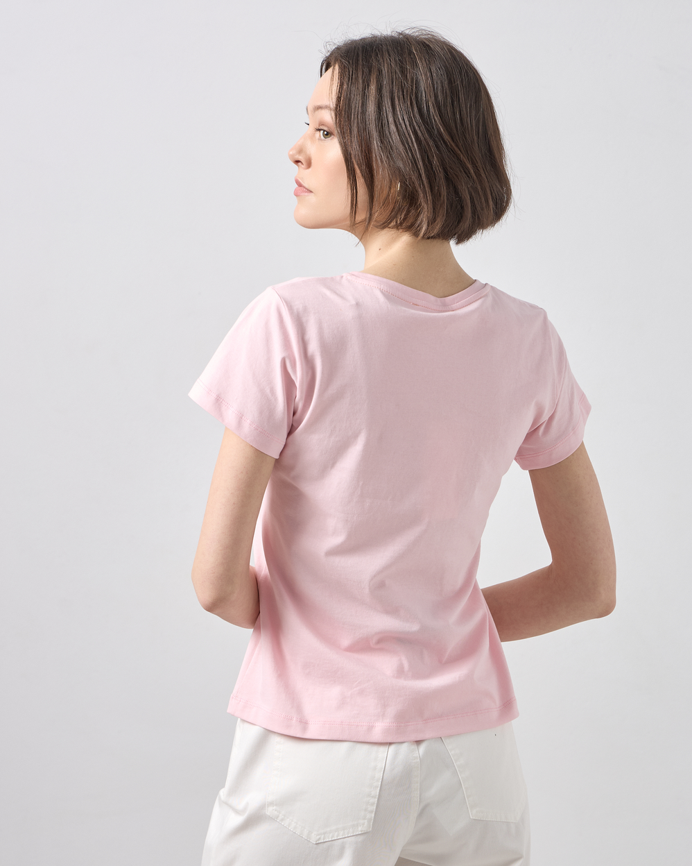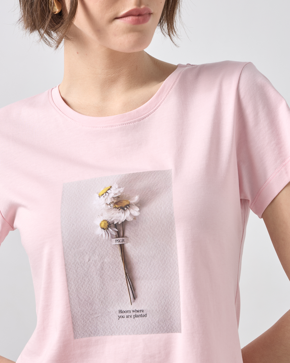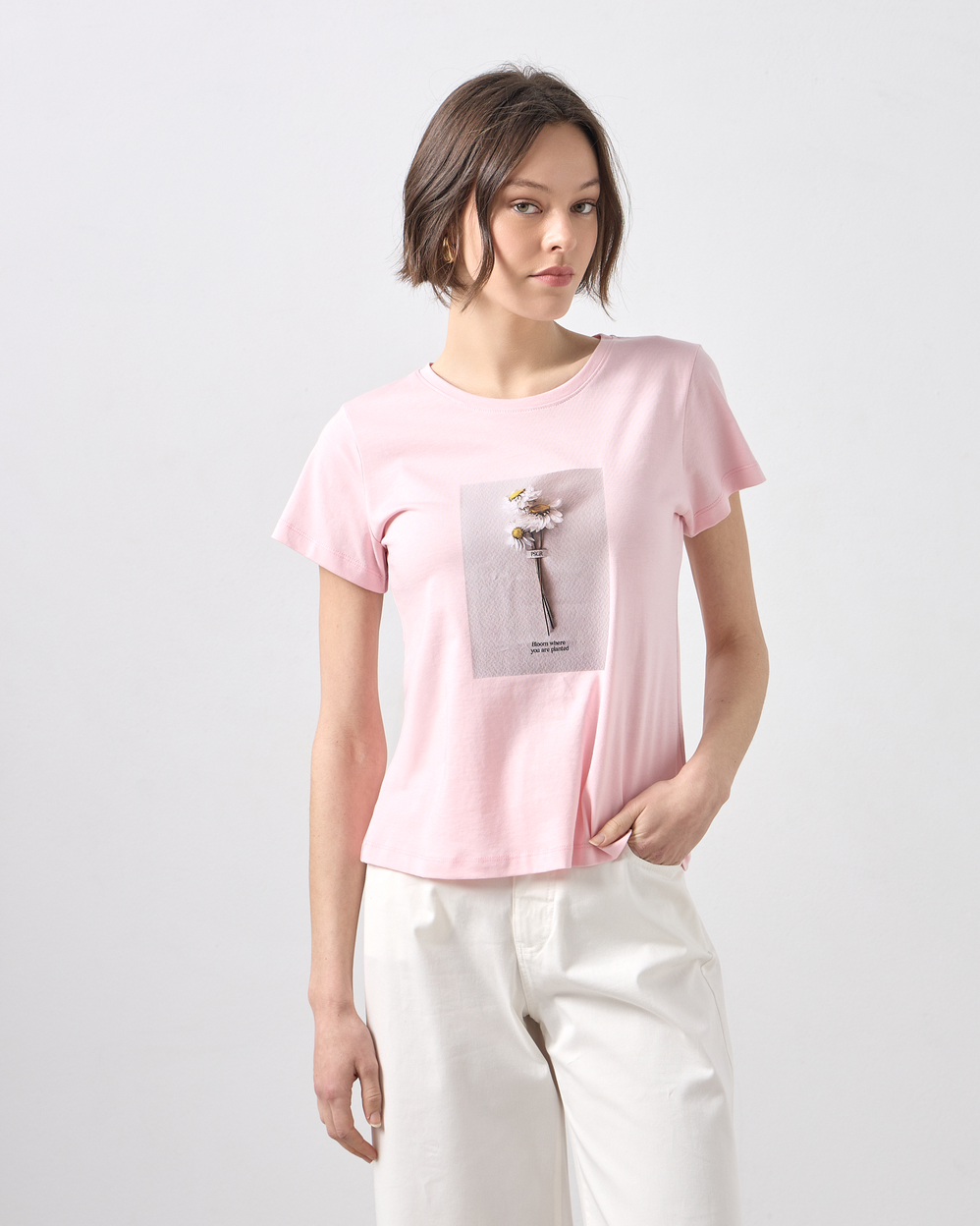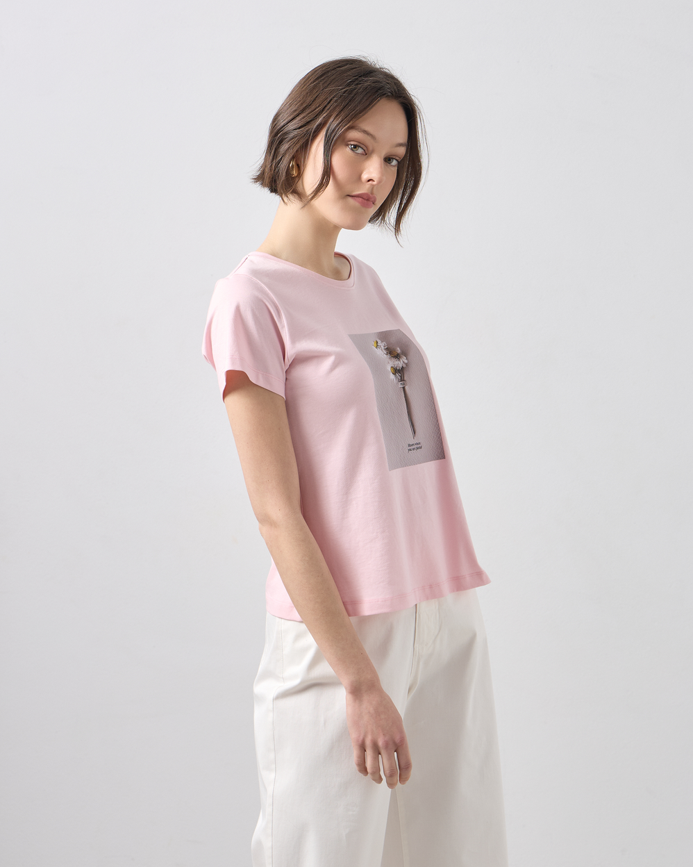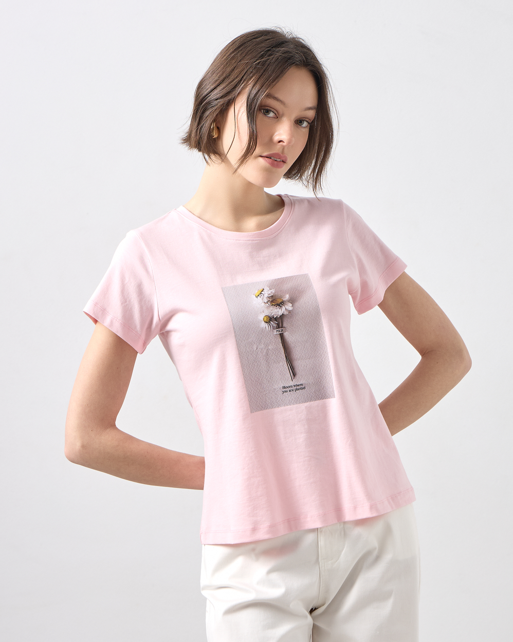 Μπλούζα κοντομάνικη με στρογγυλή λαιμόκοψη, στάμπα με λουλούδι σε βαμβακερό ύφασμα, σε κανονική γραμμή