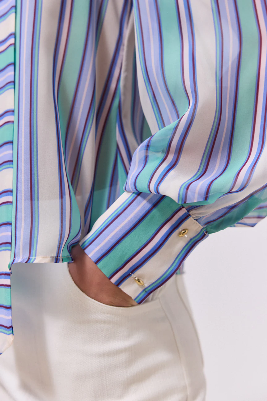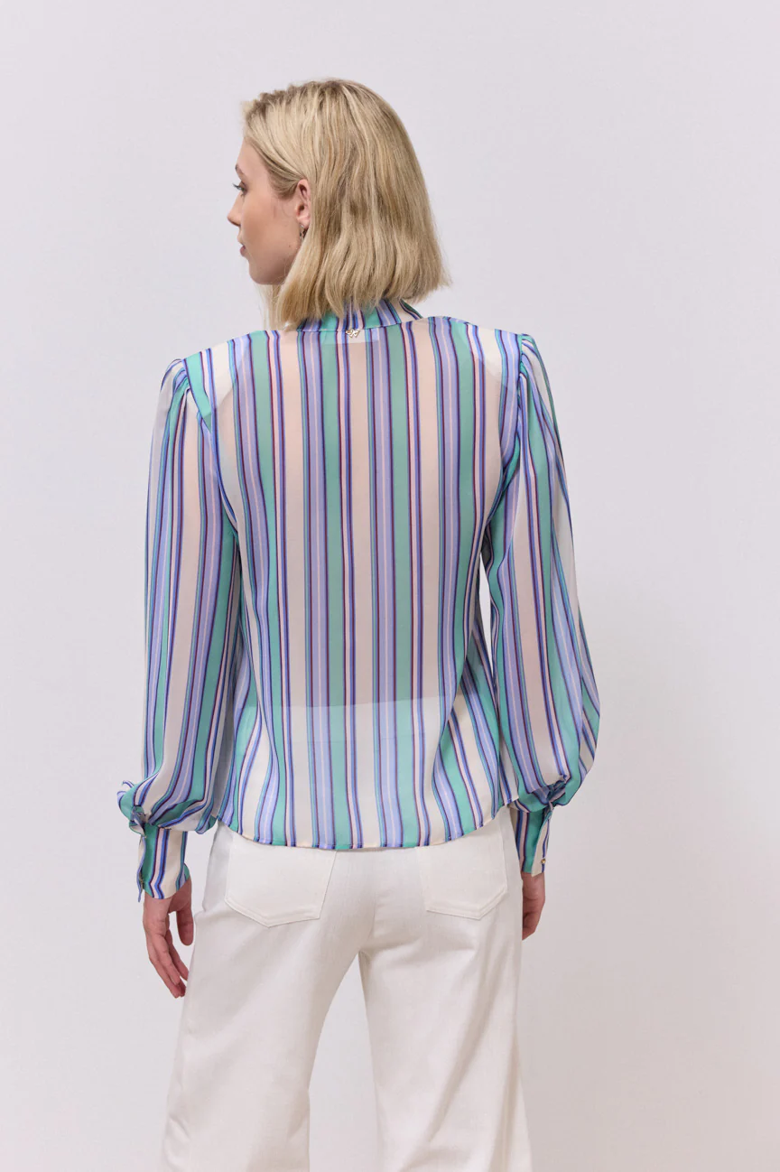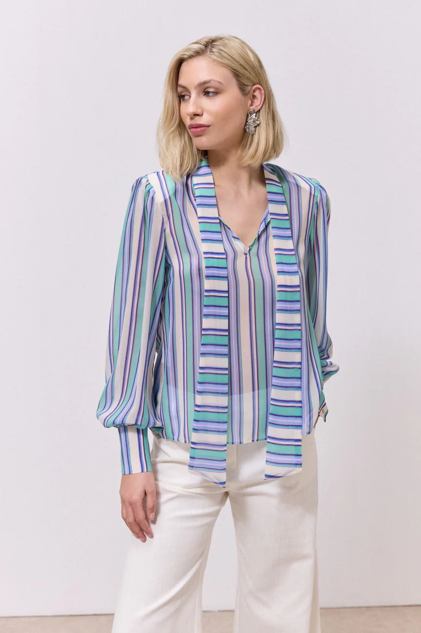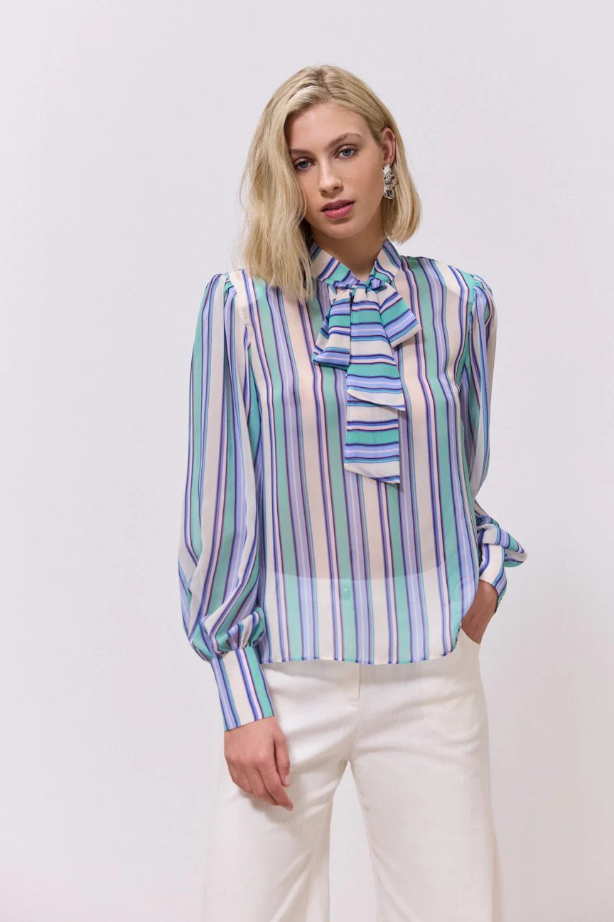 Μπλούζα, ριγέ.Σταθερό ύφασμα.Ίσια γραμμή με άνετη εφαρμογή.Δέσιμο μπροστά με φιόγκο.Κλείσιμο με κουμπιά στη μανσέτα του μανικιού.Βάτες στους ώμους.