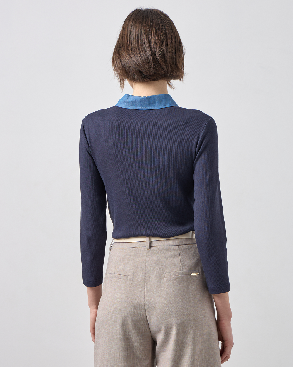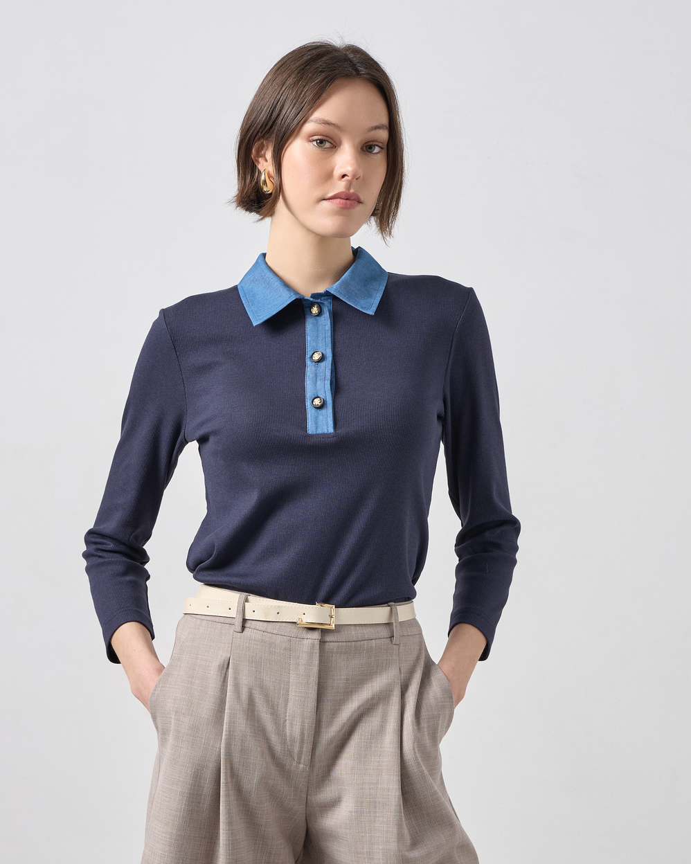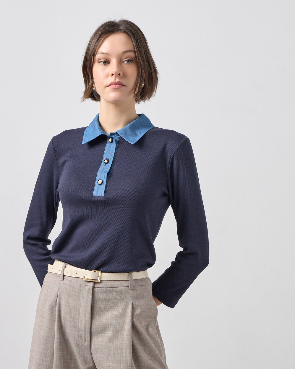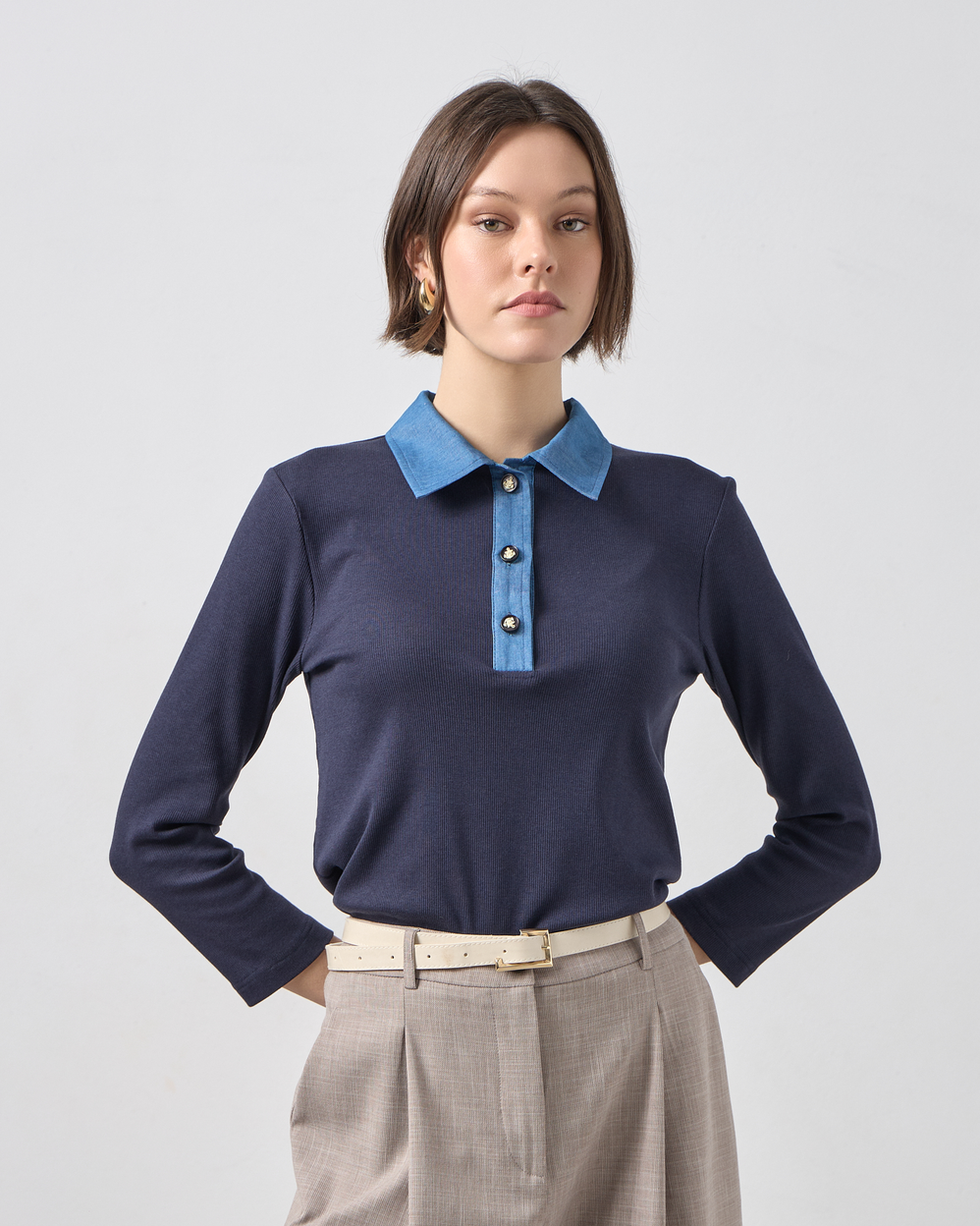 Η απόλυτη επιλογή για το “Quiet Luxury” look της άνοιξης.Αυτή η εκλεπτυσμένη πλεκτή μπλούζα σε διαχρονικό navy blue χρώμα, επαναπροσδιορίζει το κλασικό polo στυλ.Συνδυάζει την απαλή υφή ενός ποιοτικού λεπτού πλεκτού με τις μοντέρνες λεπτομέρειες από denim ύφασμα στον γιακά και την πατιλέτα, δημιουργώντας μια εντυπωσιακή αντίθεση που μαγνητίζει τα βλέμματα.
