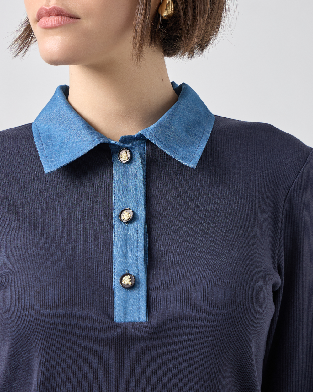 Polo Knit Blouse με Denim Λεπτομέρειες – Navy Blue