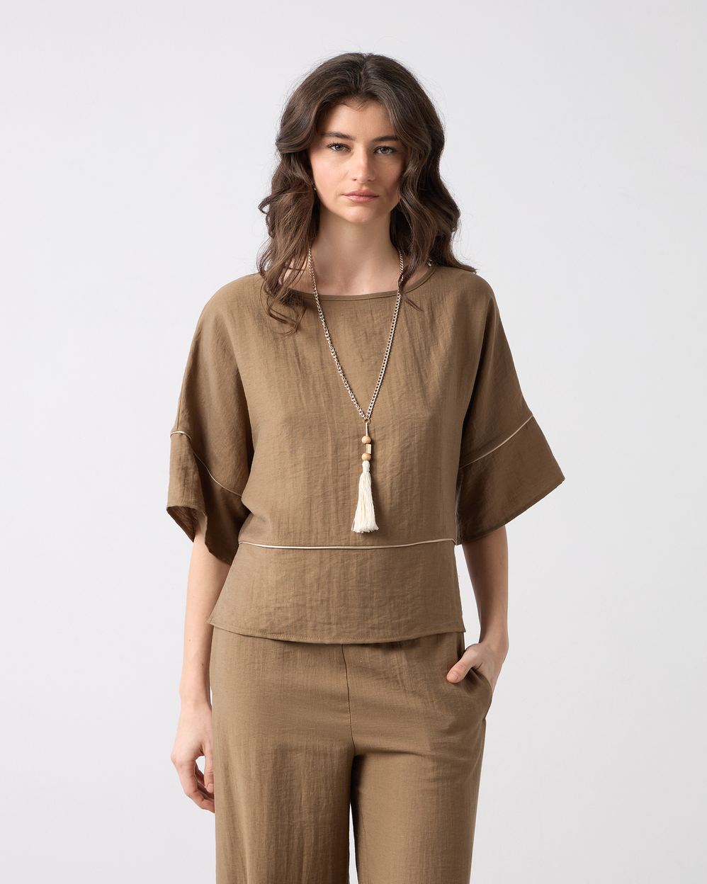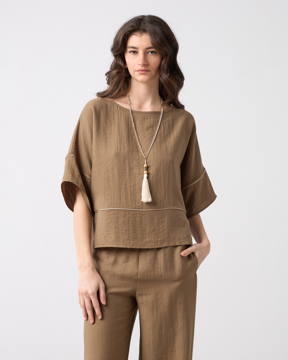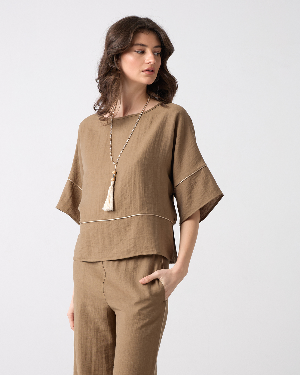 Μπλούζα με λαιμόκοψη χαμόγελο, μανίκι 3/4, διακοσμητική τρέσα σε άνετη εφαρμογή