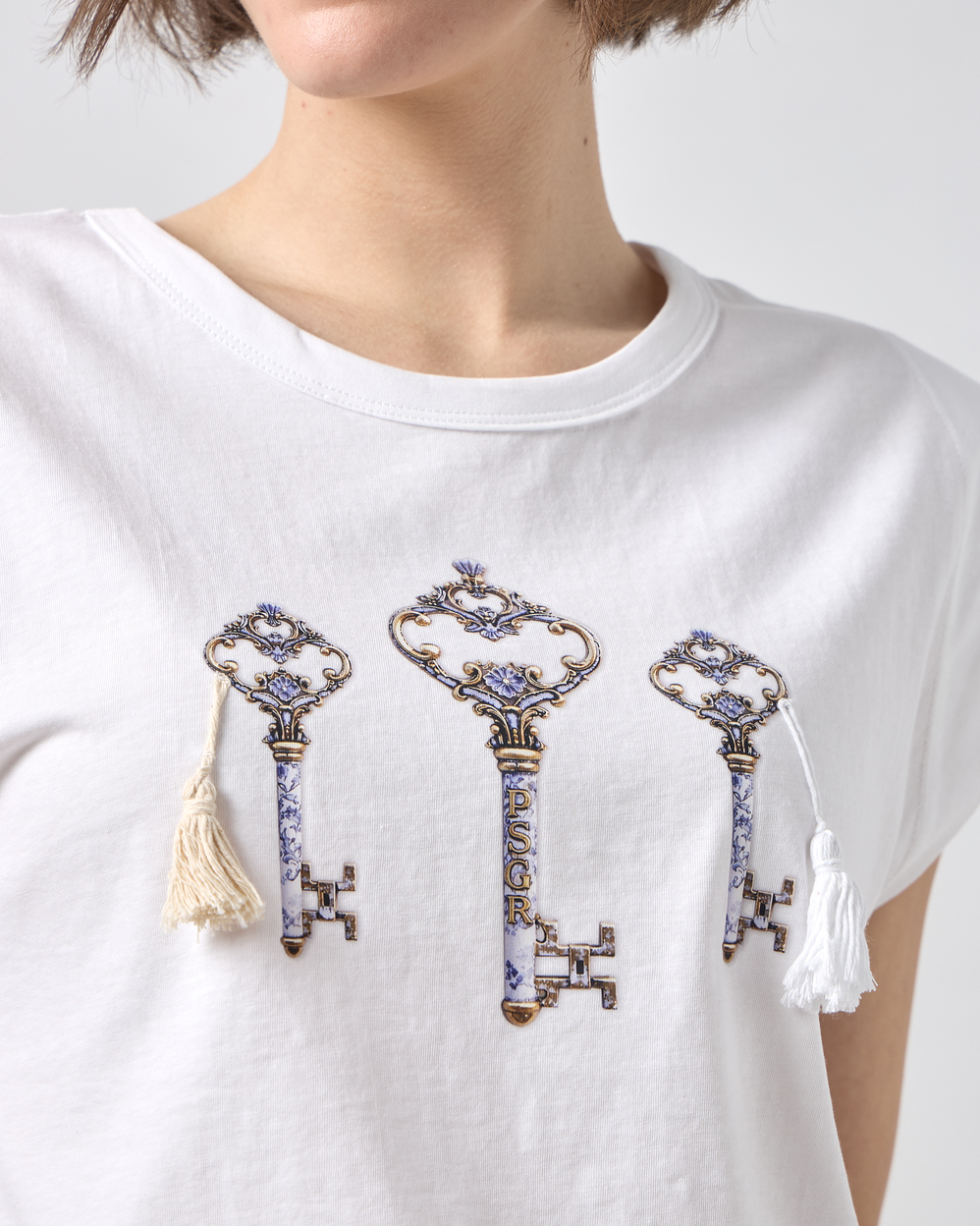 Μπλούζα κοντομάνικη με στρογγυλή λαιμόκοψη, στάμπα με κλειδιά, σε βαμβακερό ύφασμα, σε κανονική εφαρμογή