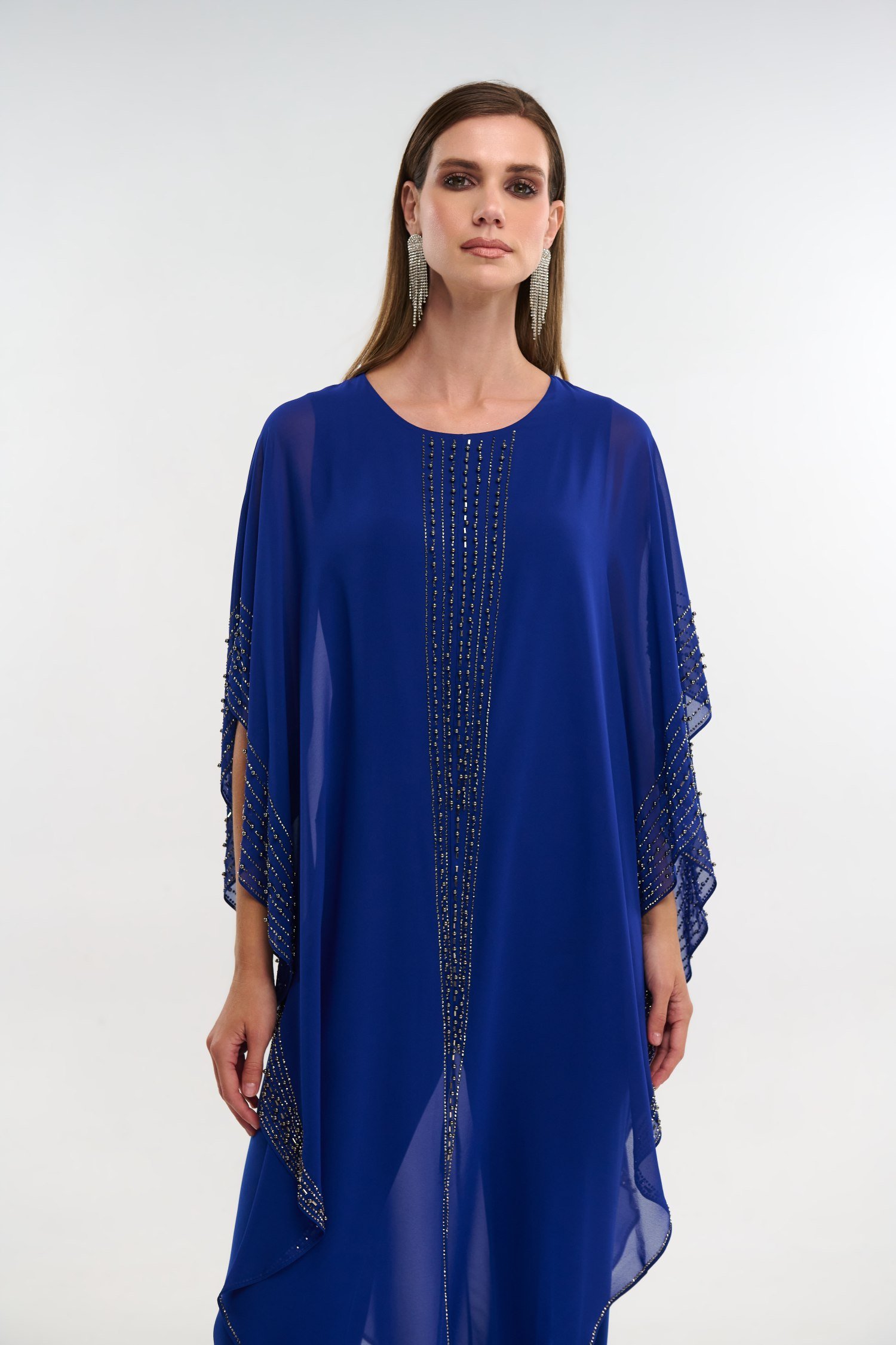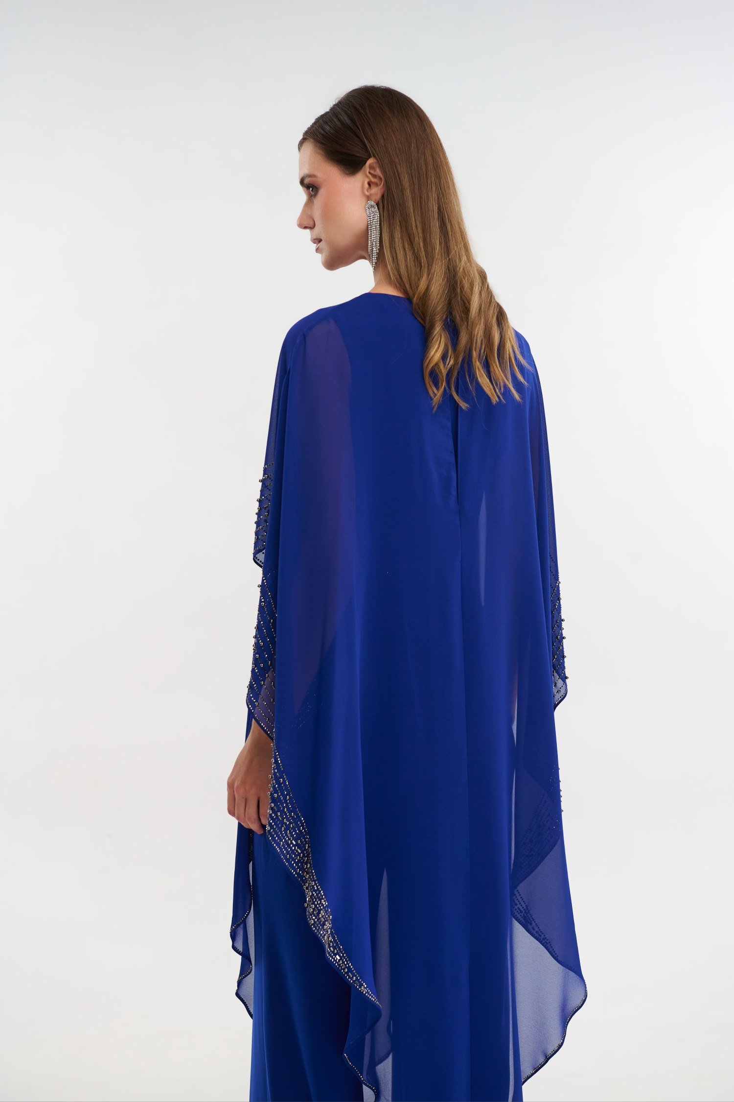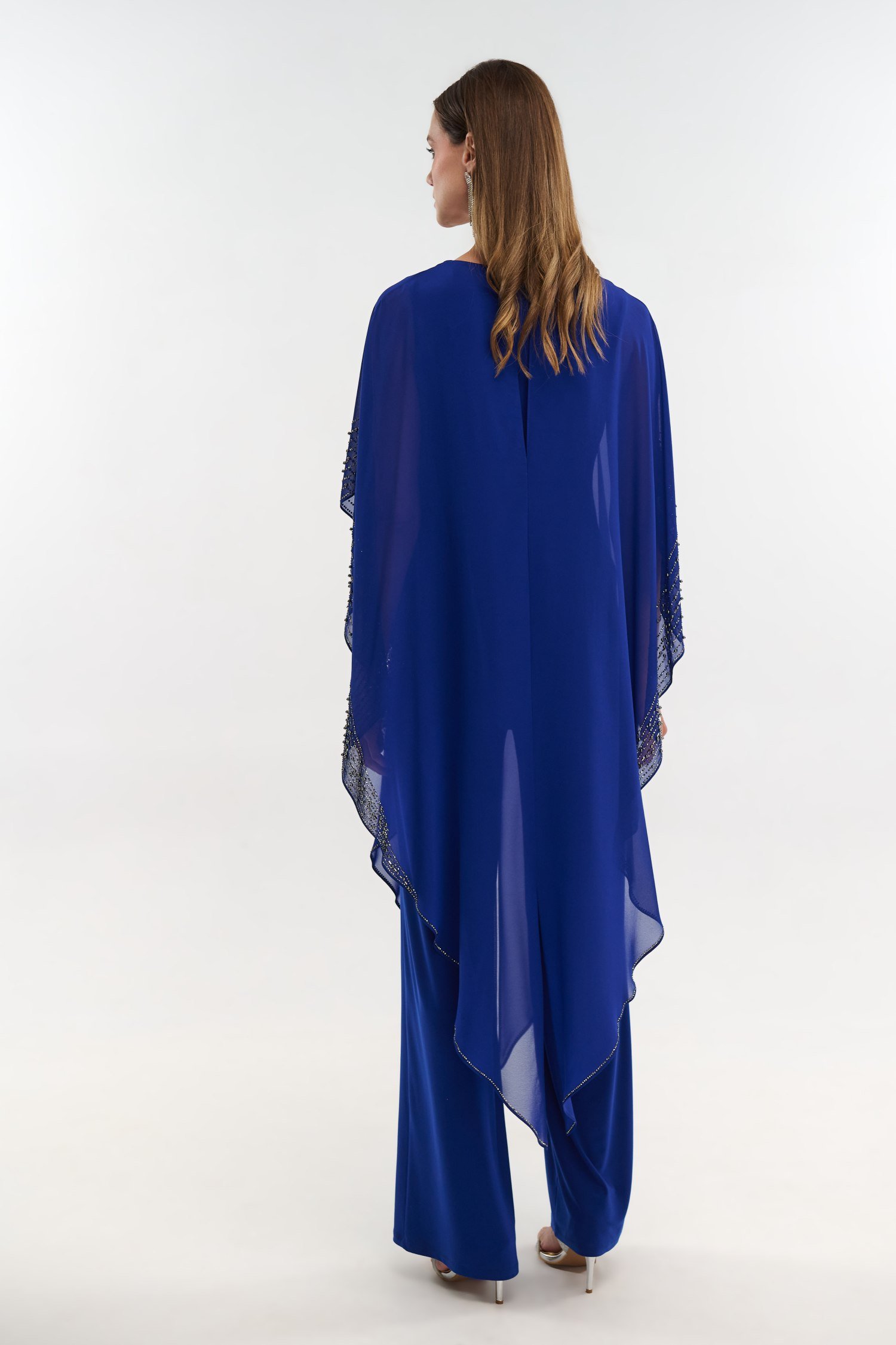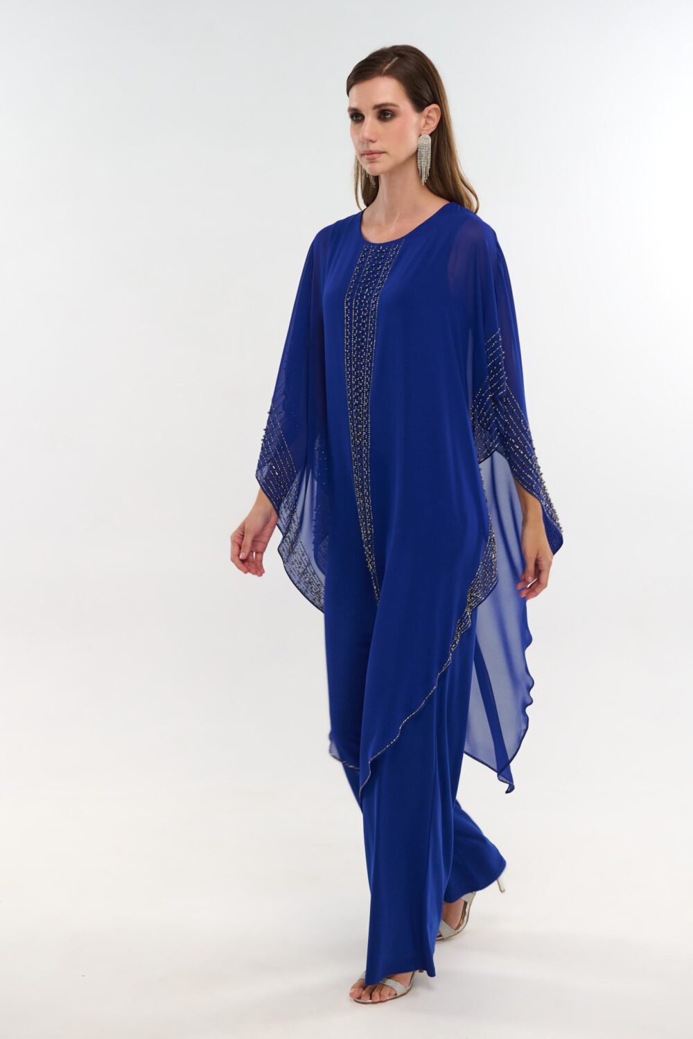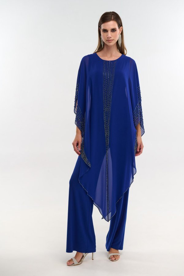 Γυναικεία ολόσωμη φόρμα σε χρώμα ηλεκτρίκ. Το ύφασμά της είναι ελαστικό ζέρσεϊ το οποίο καλύπτεται από μουσελίνα η οποία πέφτει χυτή. Περιμετρικά της μουσελίνας καθώς και μπροστά υπάρχει κεντημένο στρας για έξτρα λάμψη. Διαθέσιμη σε μεγάλα μεγέθη.