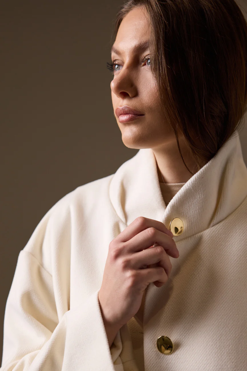 Ένα κομμάτι που επαναπροσδιορίζει το “Quiet Luxury”, συνδυάζοντας την καθαρή, μίνιμαλ αισθητική με λαμπερές λεπτομέρειες που κλέβουν τις εντυπώσεις.Τα χρυσά μεταλλικά κουμπιά και η ασορτί αγκράφα στη ζώνη προσδίδουν μια premium αίσθηση υψηλής ραπτικής.Διαθέτει όρθιο γιακά (high-neck) που χαρίζει μια μοντέρνα σιλουέτα και προσφέρει επιπλέον προστασία από το κρύο.