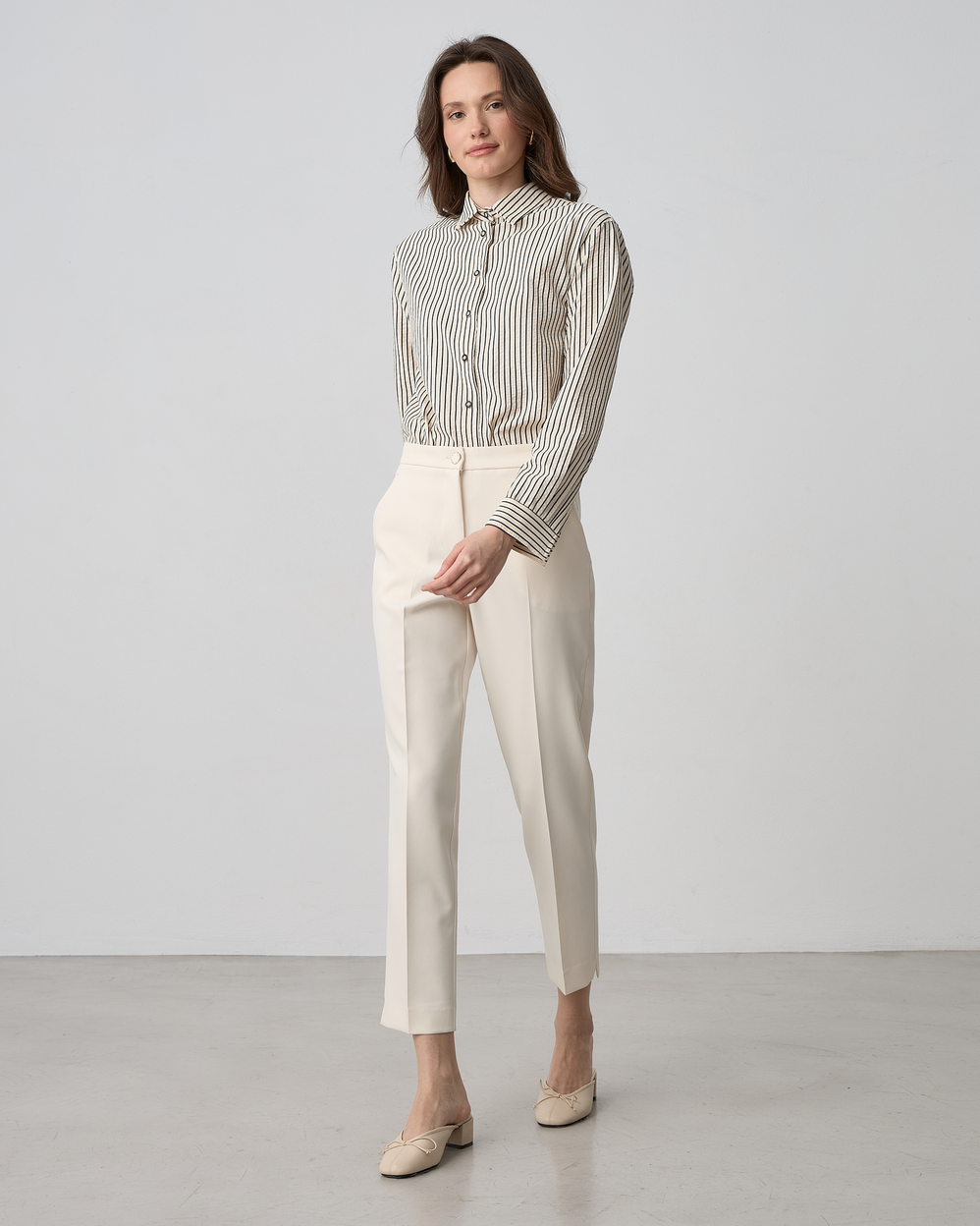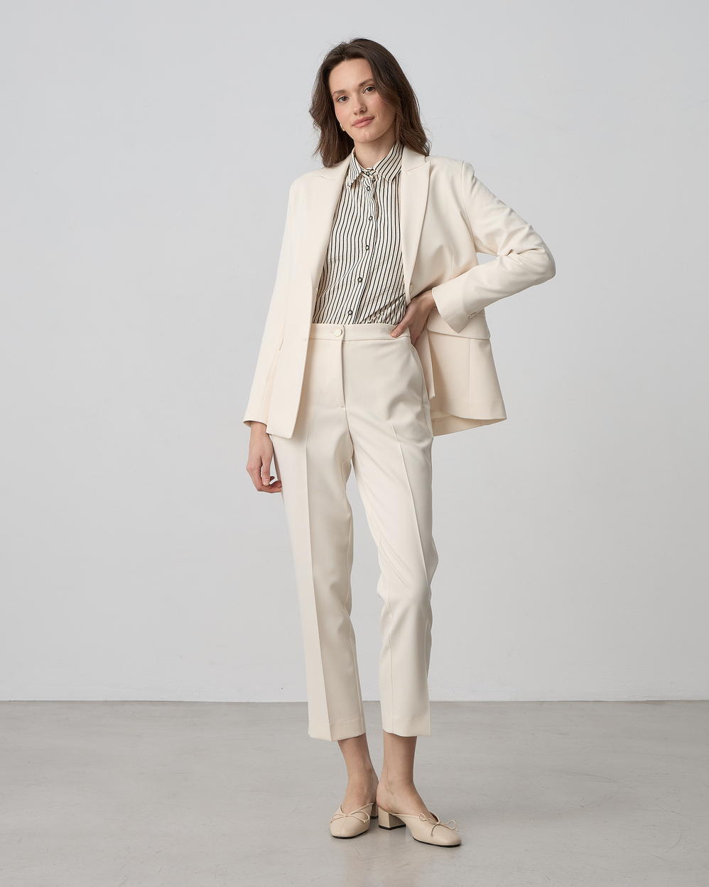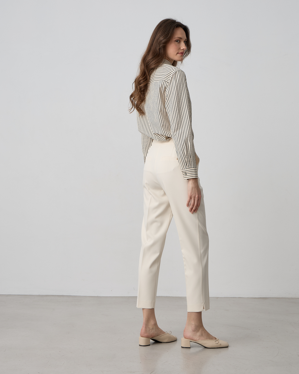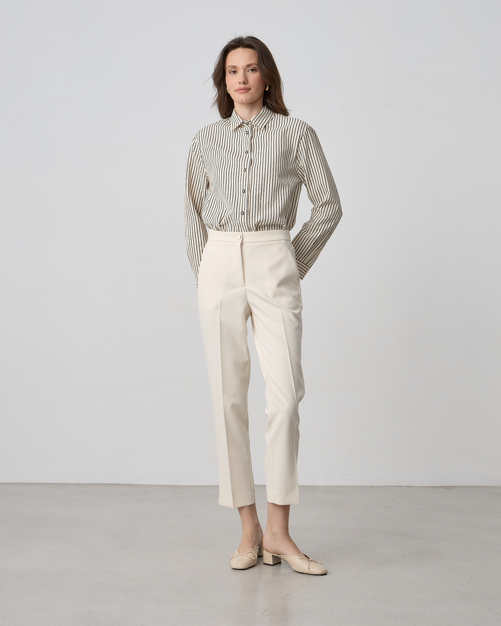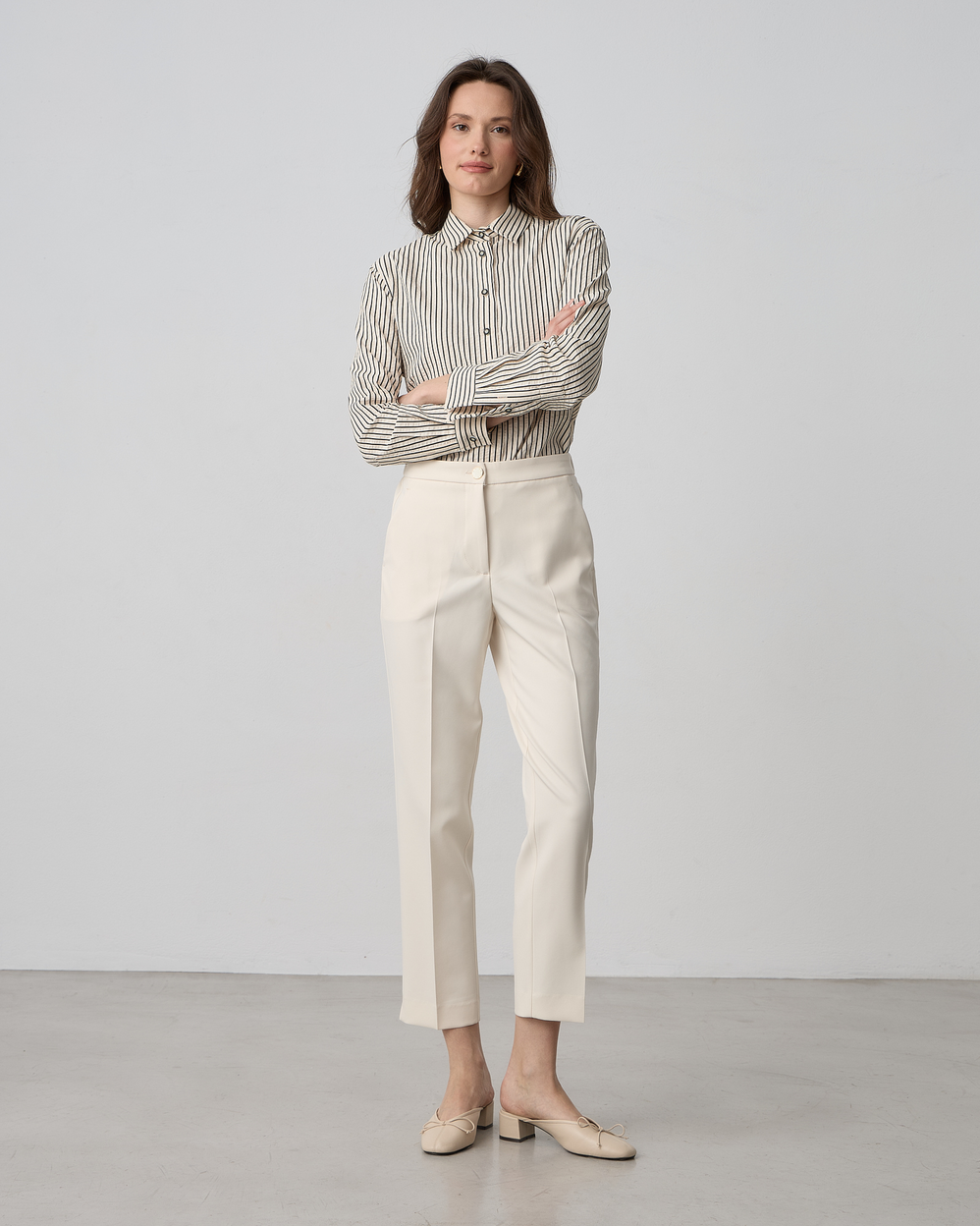 Παντελόνι ψηλόμεσο με λάστιχο στα πλαΐνά, κλείσιμο μπροστά με φερμουάρ και κουμπί, τσέπες στο πλάι, σε κρεπ υφή, σε κανονική γραμμή
