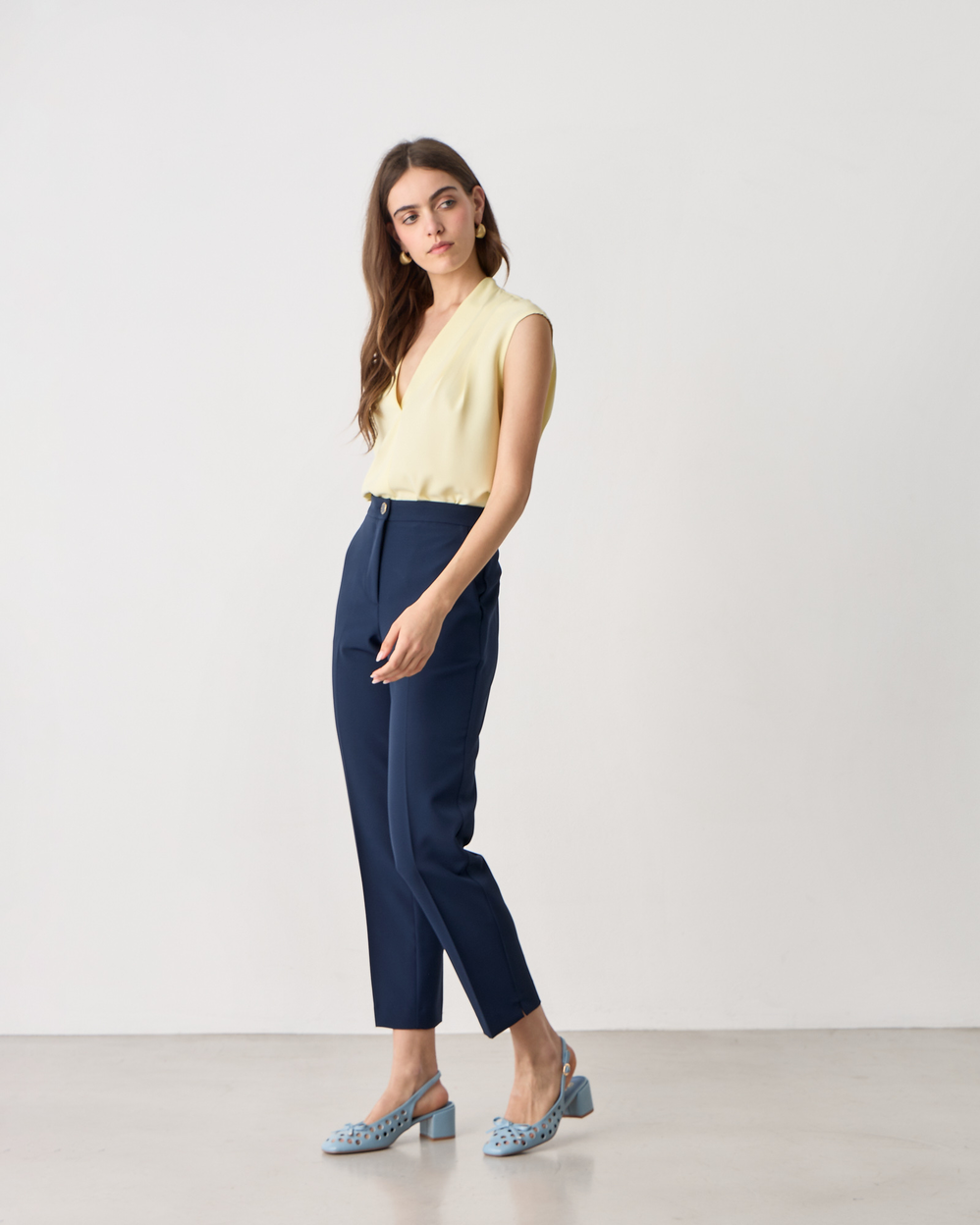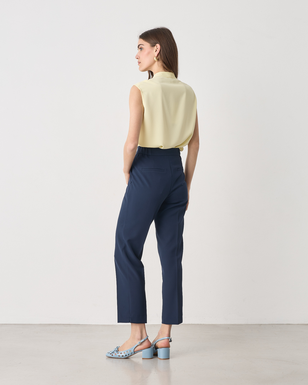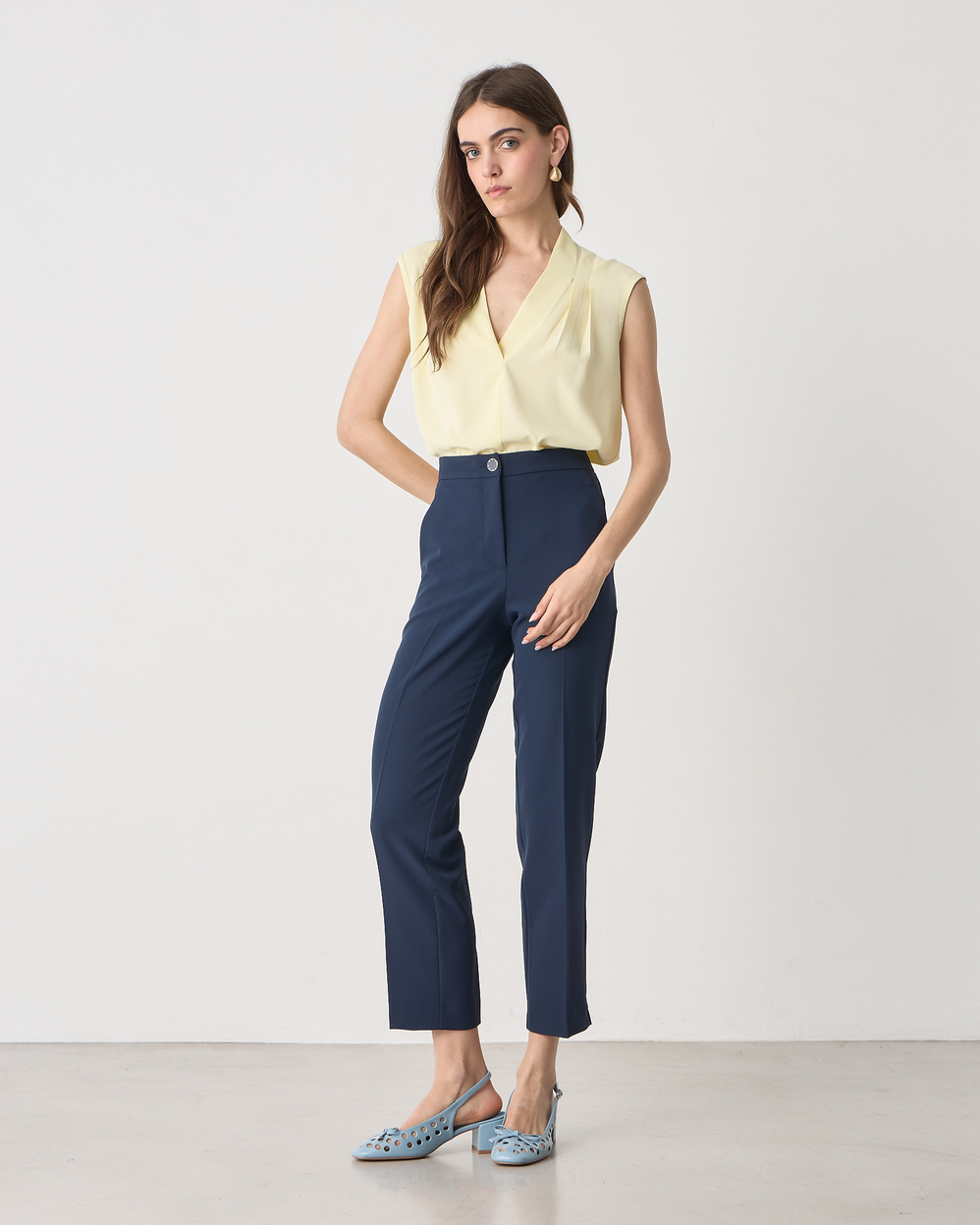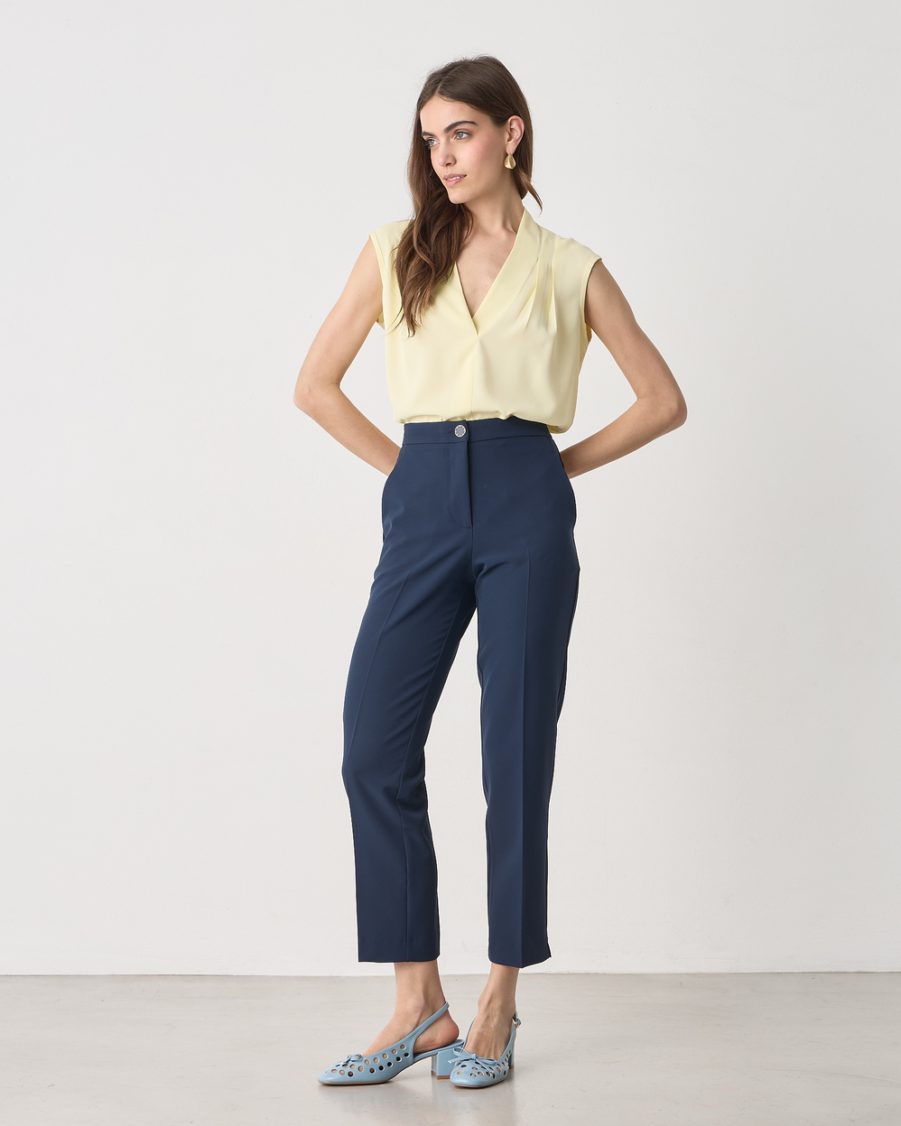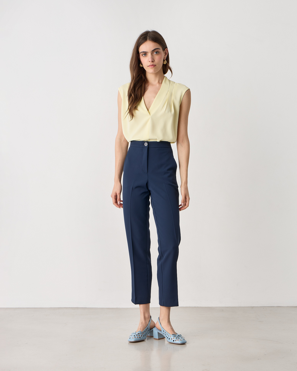 Παντελόνι ψηλόμεσο με λάστιχο στα πλαΐνά, κλείσιμο μπροστά με φερμουάρ και κουμπί, τσέπες στο πλάι, σε κρεπ υφή, σε κανονική γραμμή