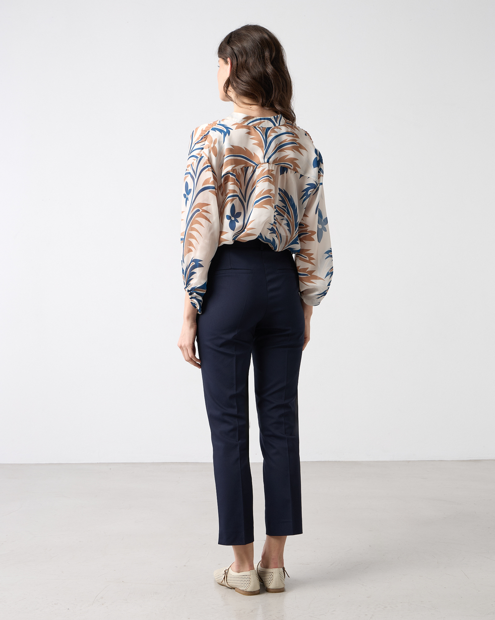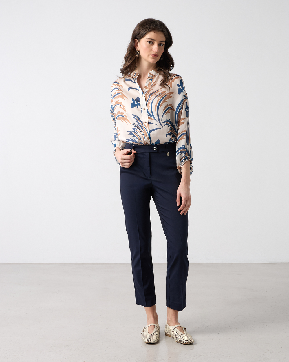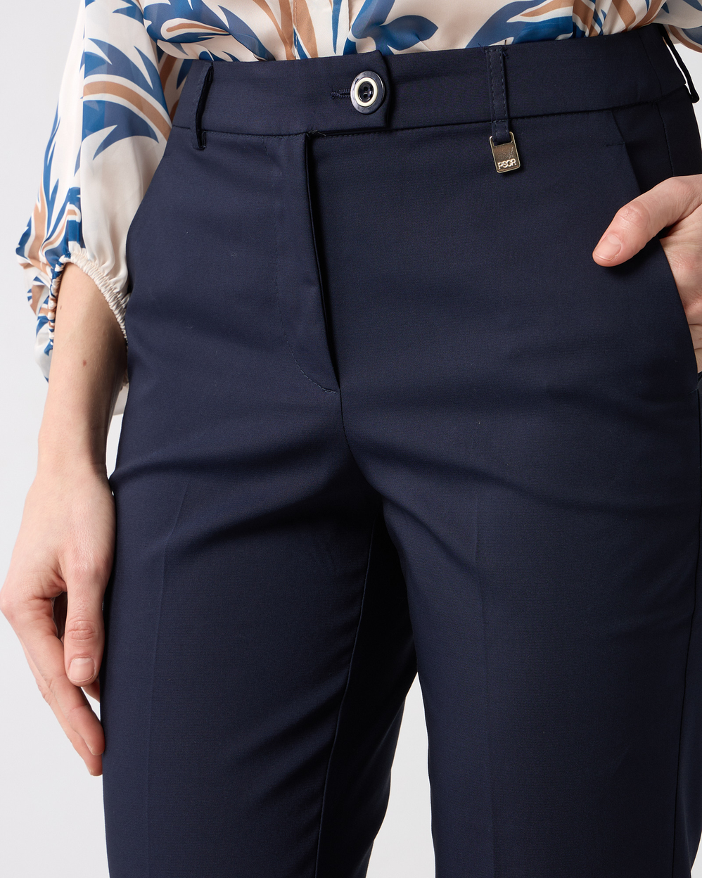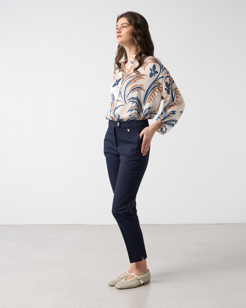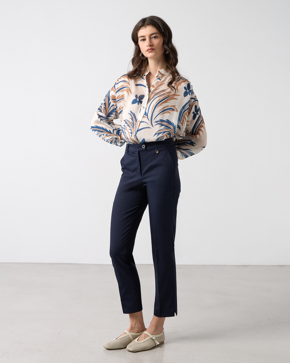 Παντελόνι cigarette σε υφή καπαρντίνα, κλείσιμο μπροστά με φερμουάρ και κουμπί, με πλαΐνές τσέπες, σε κανονική γραμμή
