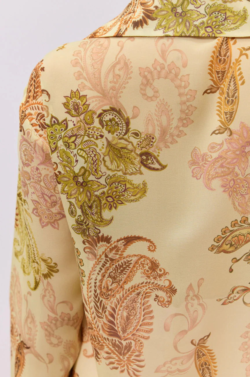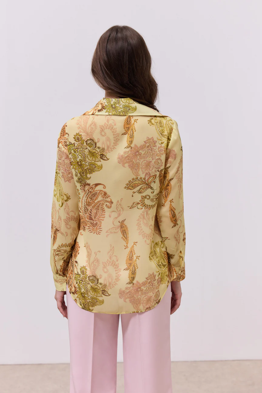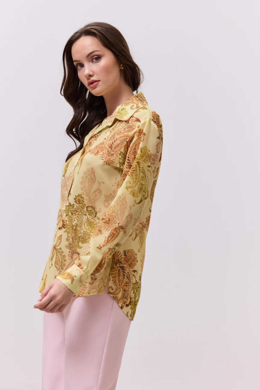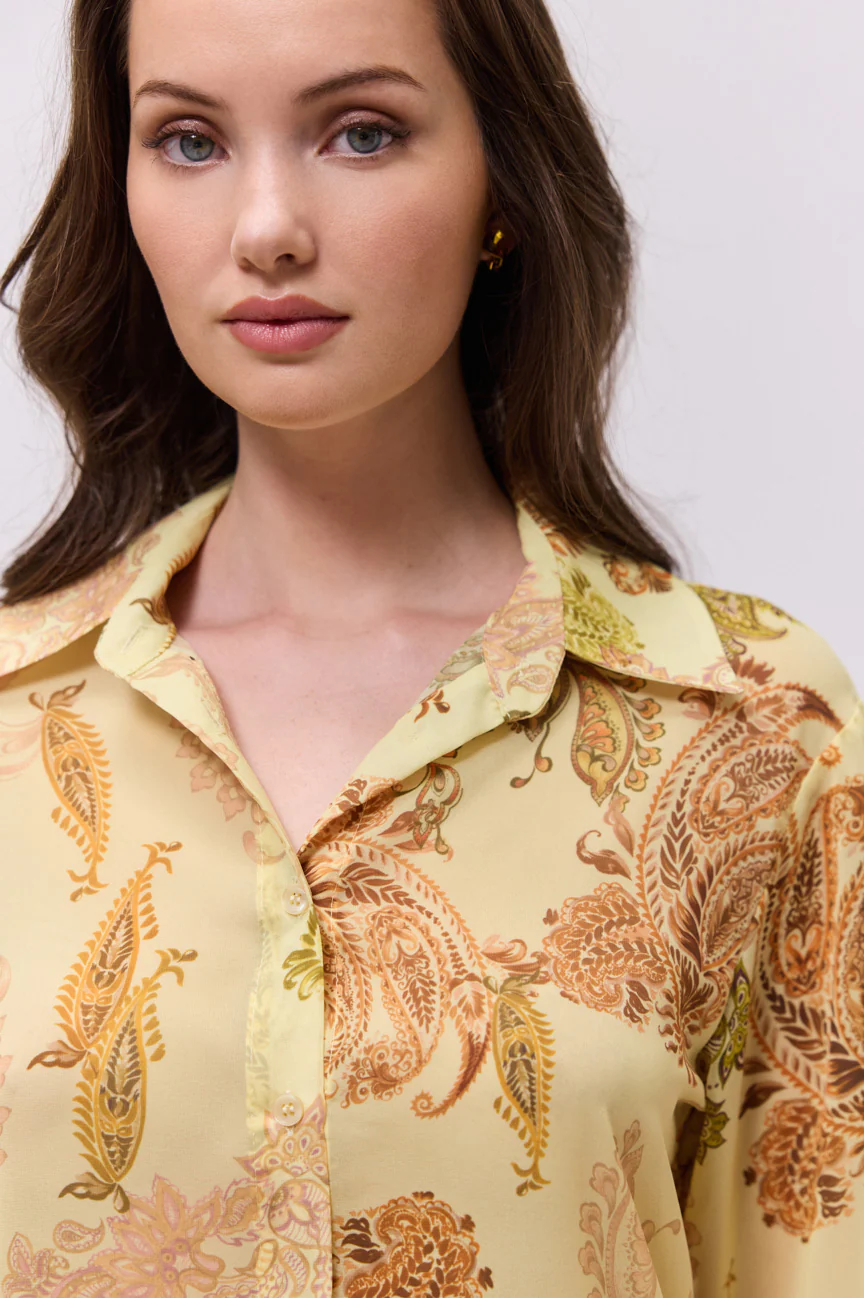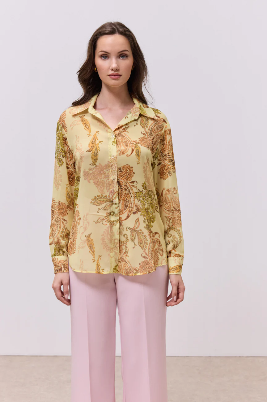 Πουκάμισο μακρυμάνικο, εμπριμέ.Σταθερό αέρινο ύφασμα με paisley μοτίβο.Κλείσιμο με κουμπιά.Η εφαρμογή του είναι άνετη και ελαφρώς χαλαρή. Ιδανικό για chic καθημερινές εμφανίσεις αλλά και για πιο προσεγμένα looks γραφείου, συνδυάζεται άψογα με μονόχρωμα παντελόνια ή φούστες, αφήνοντας το μοτίβο να πρωταγωνιστήσει στο σύνολο.