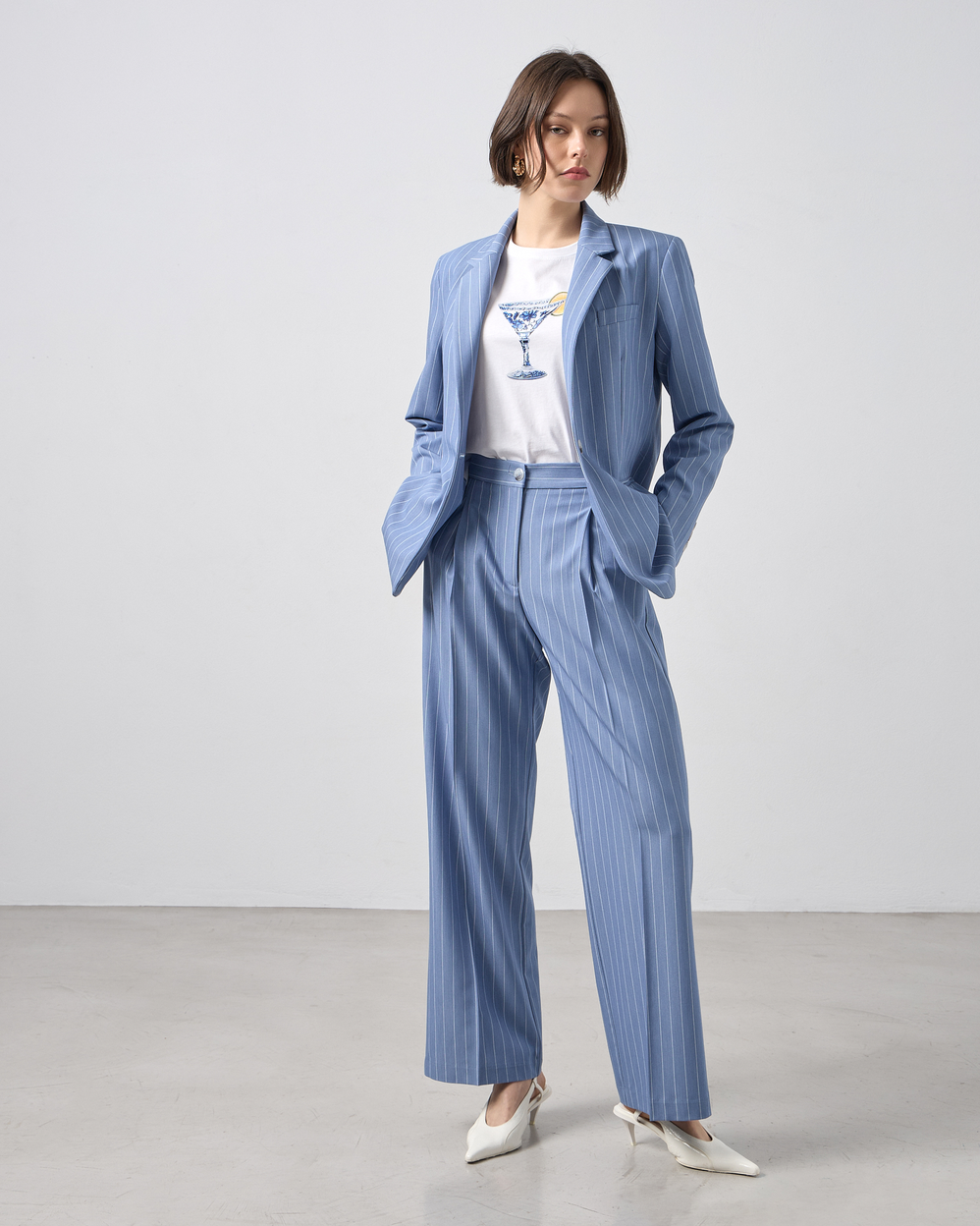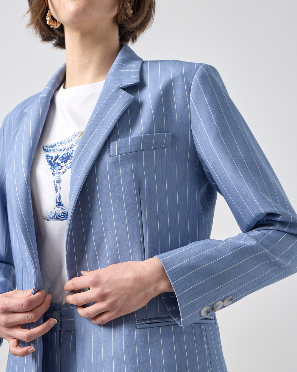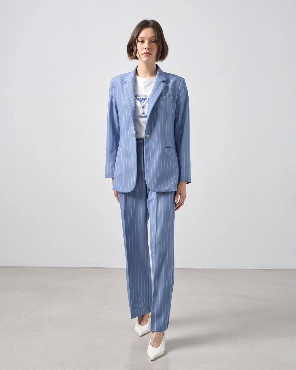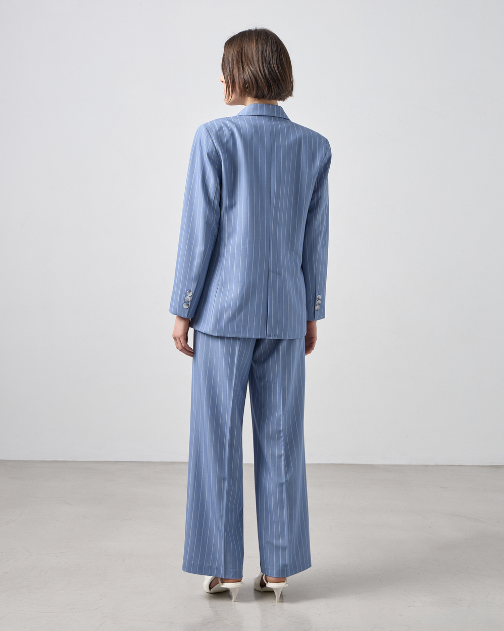 Σακάκι ριγέ με γιακά με πέτο, μακρυμάνικο, ψεύτικες τσέπες στο μπροστινό μέρος, εσωτερική φόδρα, κλείσιμο μπροστά με κουμπί, σε κανονική γραμμή