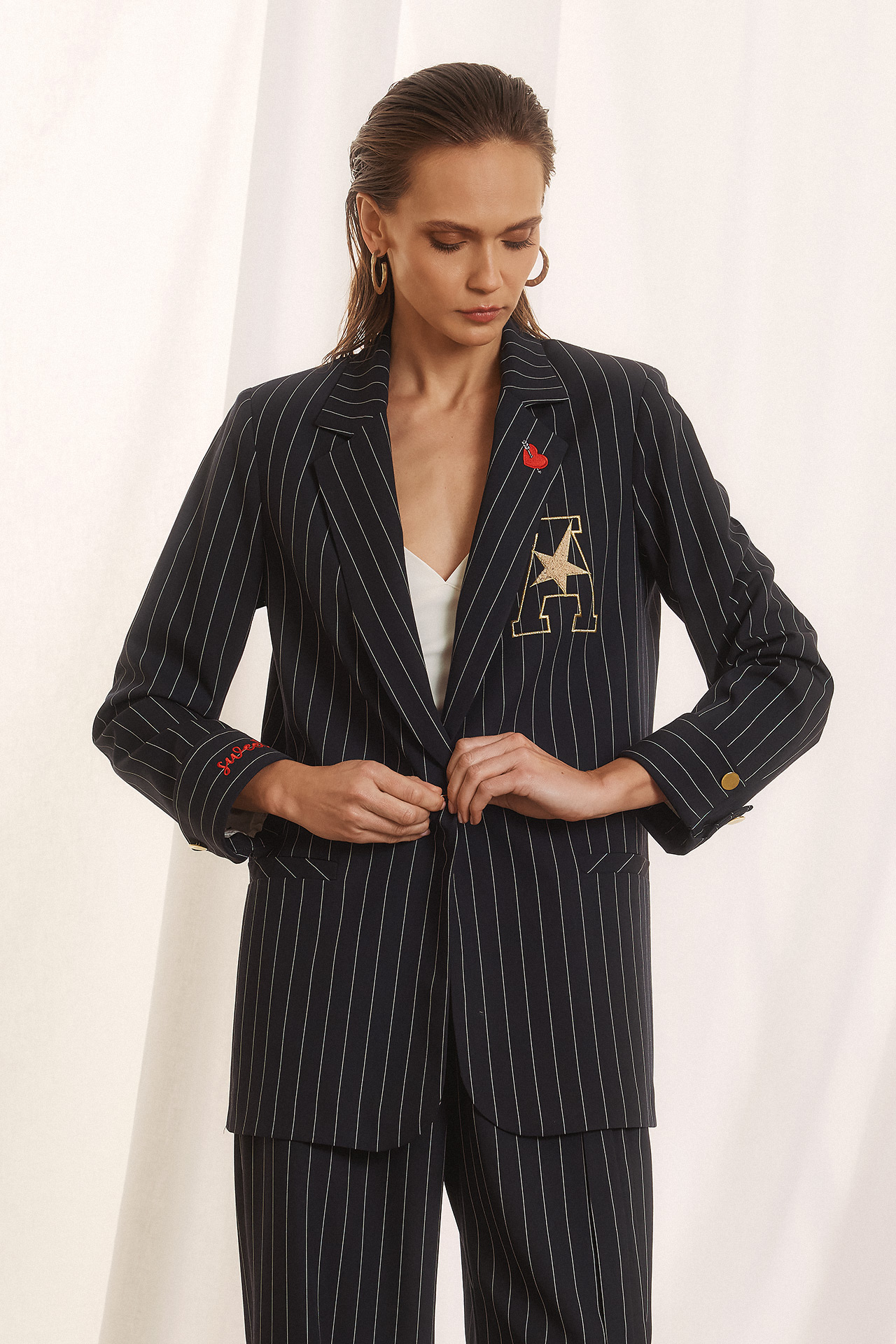 Υψηλής ποιότητας ύφασμα σε βαθύ μπλε χρώμα με κομψή εκρού ρίγα για τέλεια εφαρμογή και σιλουέτα.