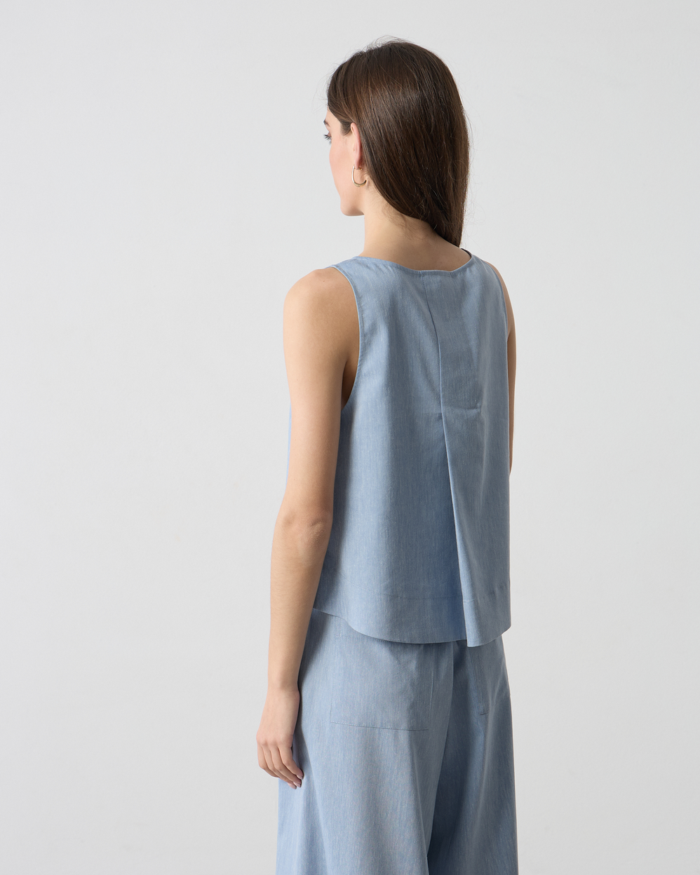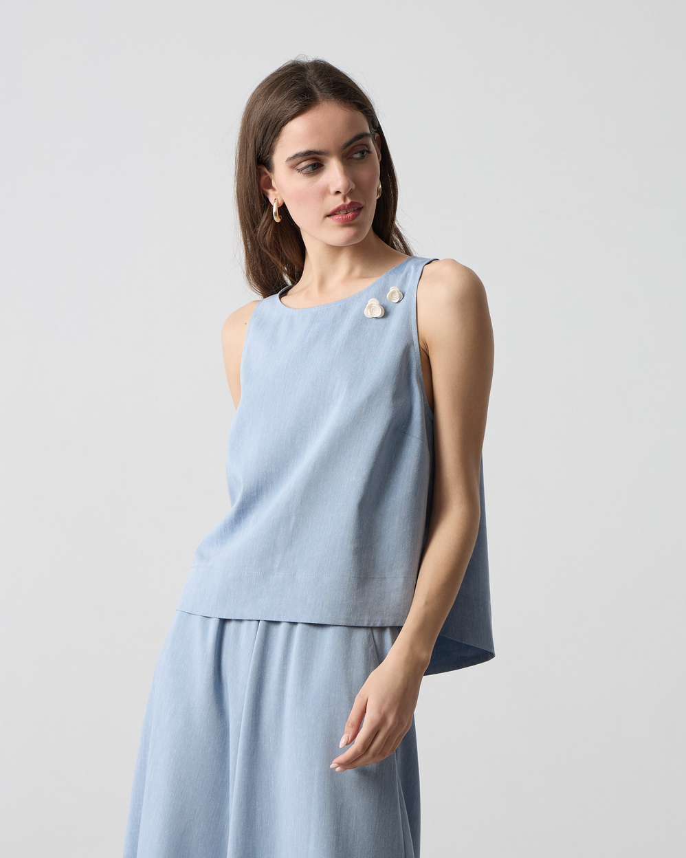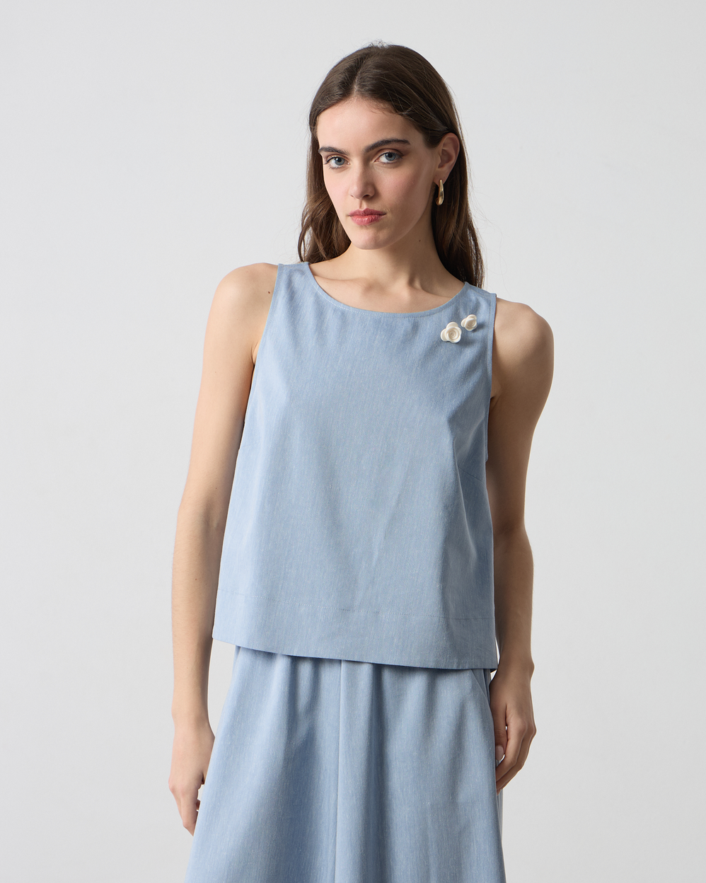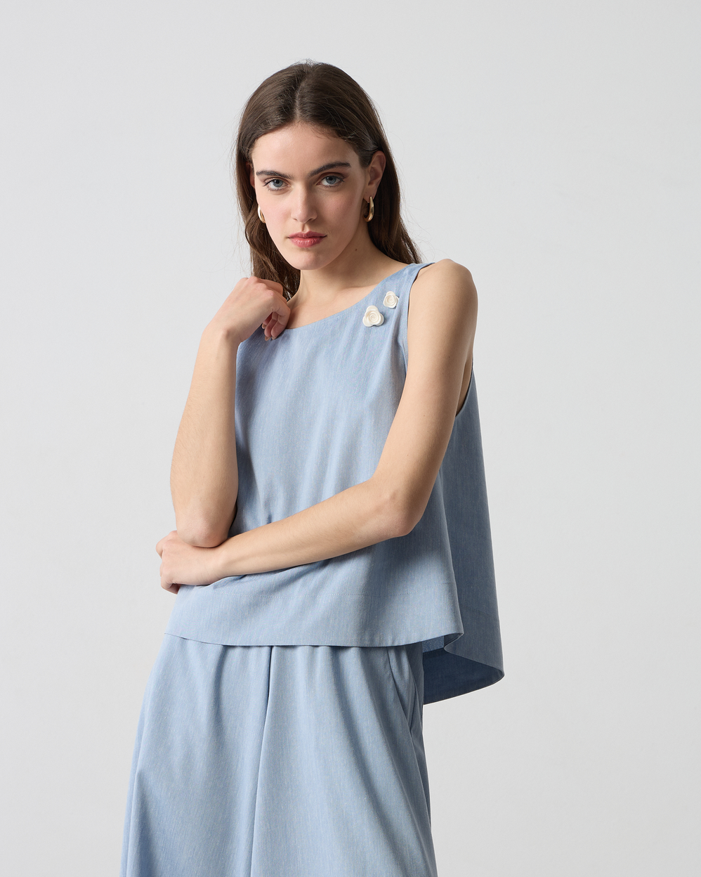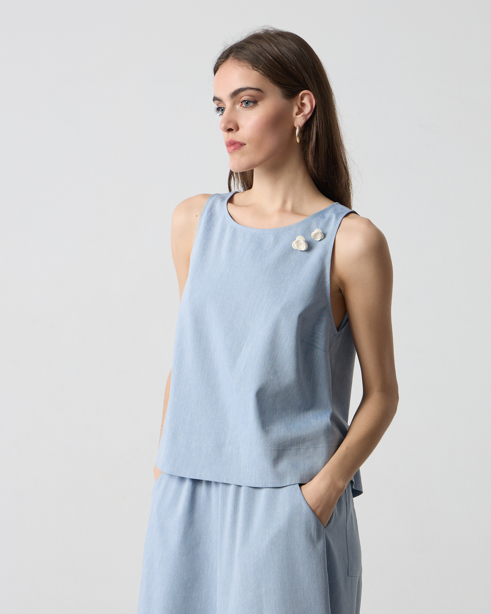 Τοπ αμάνικο με στρογγυλή λαιμόκοψη, διακριτικά διακοσμητικά στον ώμο, κουφόπιετα στο πίσω μέρος σε άνετη γραμμή
