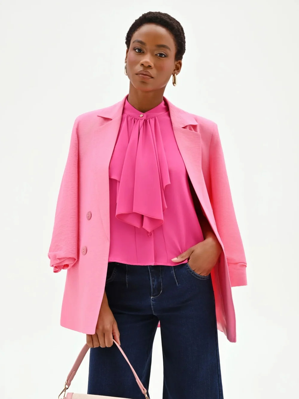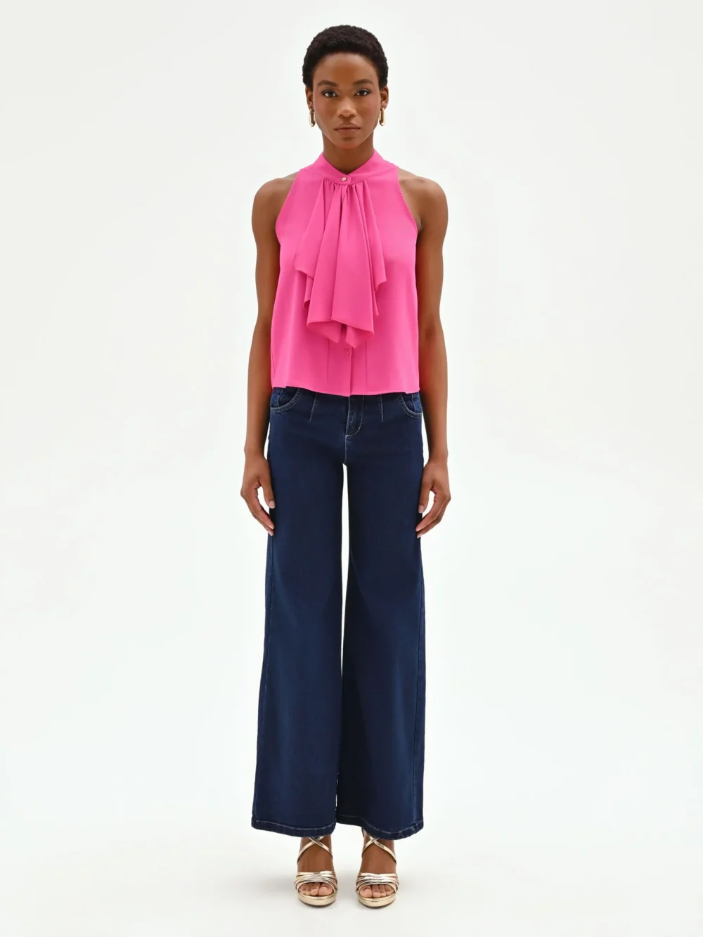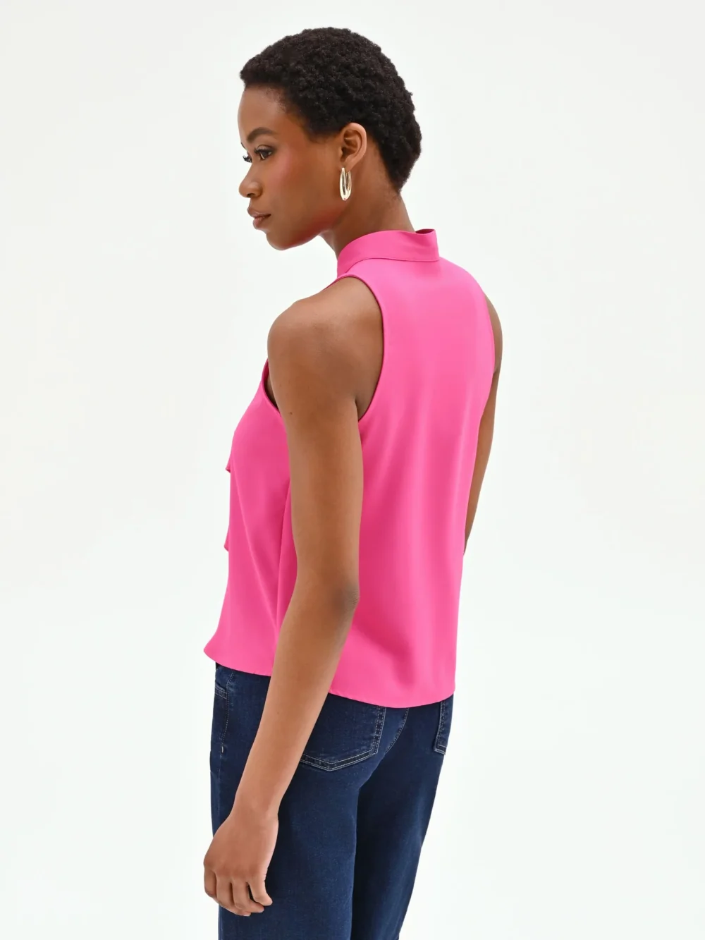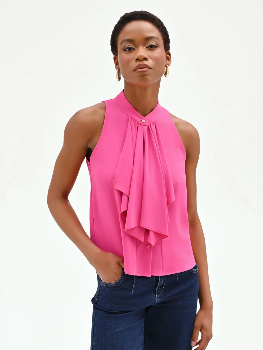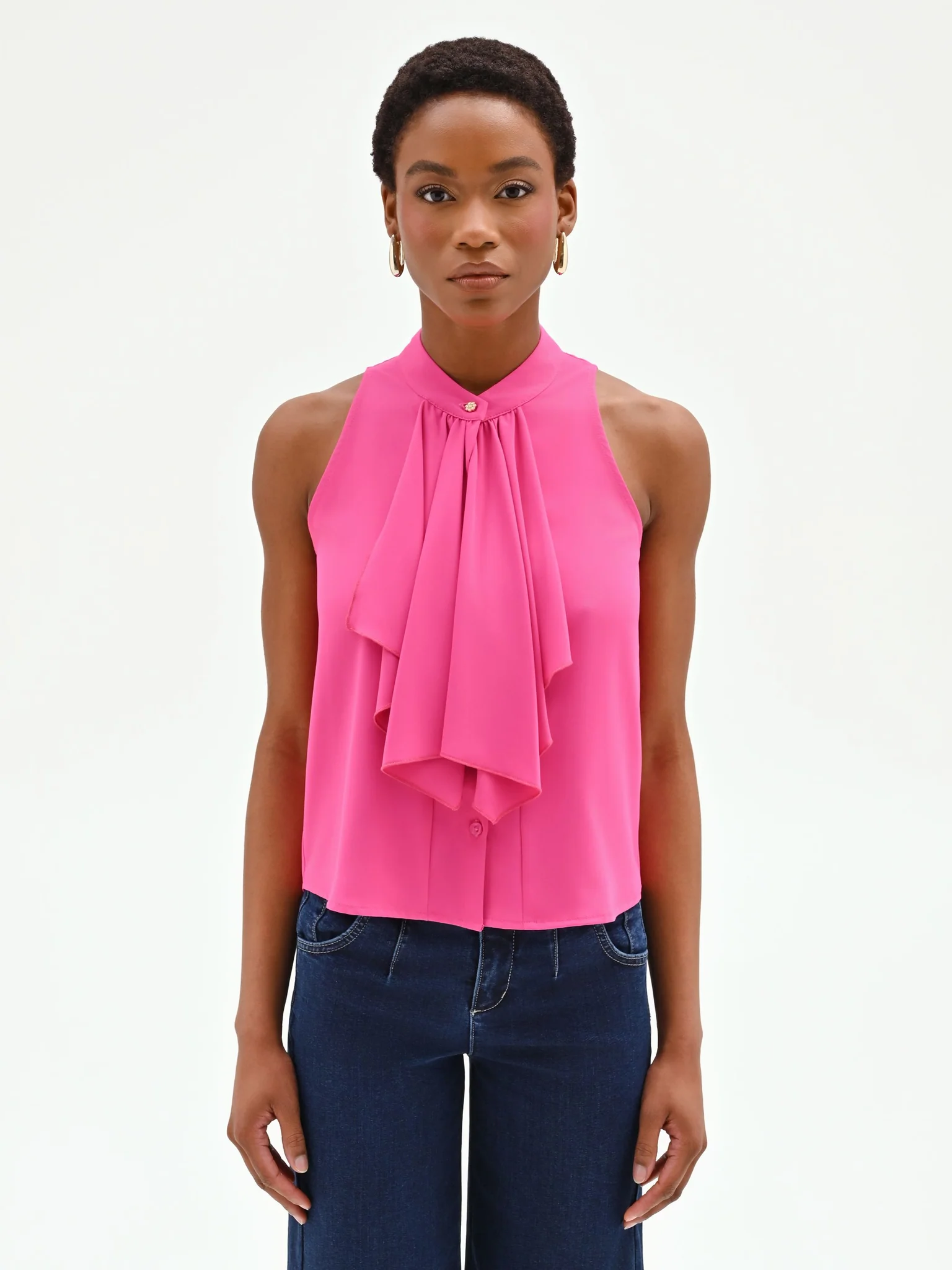 Η ένταση του φούξια συναντά την ελαφρότητα της ζορζέτας σε αυτό το εκλεπτυσμένο τοπ, ένα βασικό κομμάτι για να ανανεώσετε την γκαρνταρόμπα σας για τον ζεστό καιρό. Το σχέδιο διαθέτει ψηλό λαιμό, ο οποίος χρησιμεύει ως σημείο εκκίνησης για την ξεχωριστή του λεπτομέρεια: ένα πλούσιο, απαλό βολάν που ρέει μπροστά, δημιουργώντας ένα δυναμικό και εκλεπτυσμένο αποτέλεσμα με κάθε βήμα. Το κόψιμο στο halterneck αφήνει τους ώμους γυμνούς, προσθέτοντας μια αισθησιακή νότα και κολακεύοντας τη σιλουέτα με αβίαστη θηλυκότητα. Κατασκευασμένο από ένα ρευστό και ελαφρύ ύφασμα, αυτό το τοπ διαθέτει ίσιο κόψιμο που ακουμπά απαλά στη σιλουέτα, εξασφαλίζοντας άνεση και στυλ με κάθε κίνηση. Στο πίσω μέρος, ένα κούμπωμα με ένα μόνο κουμπί στο λαιμό παρέχει ένα διακριτικό κλείσιμο που διατηρεί τις αρμονικές γραμμές του σχεδίου. Ένα ευέλικτο κομμάτι που μπορεί να φορεθεί με πολλούς τρόπους, είναι ιδανικό για κοκτέιλ ηλιοβασιλέματος ή για μια τελετή κατά τη διάρκεια της ημέρας. Ολοκληρώστε την εμφάνιση με φωτεινά αξεσουάρ για να ενισχύσετε τη ζωντανή του απόχρωση και να δημιουργήσετε ένα αξέχαστο ντύσιμο.