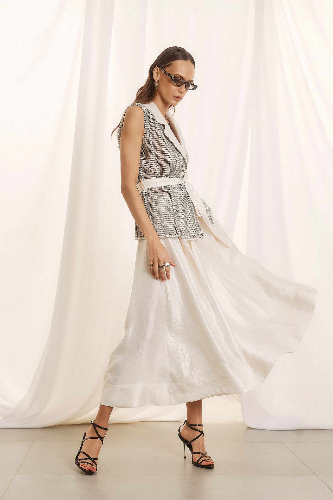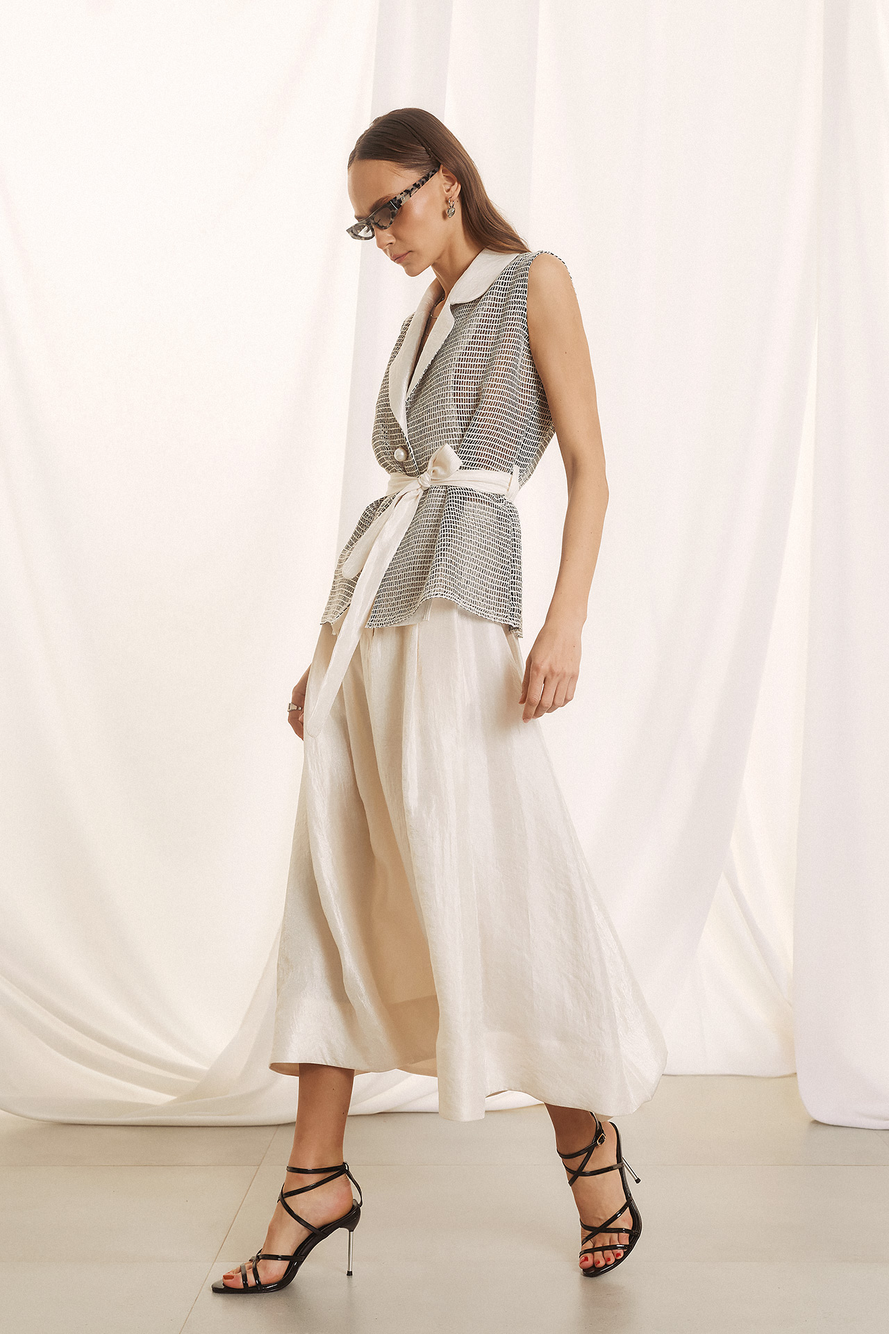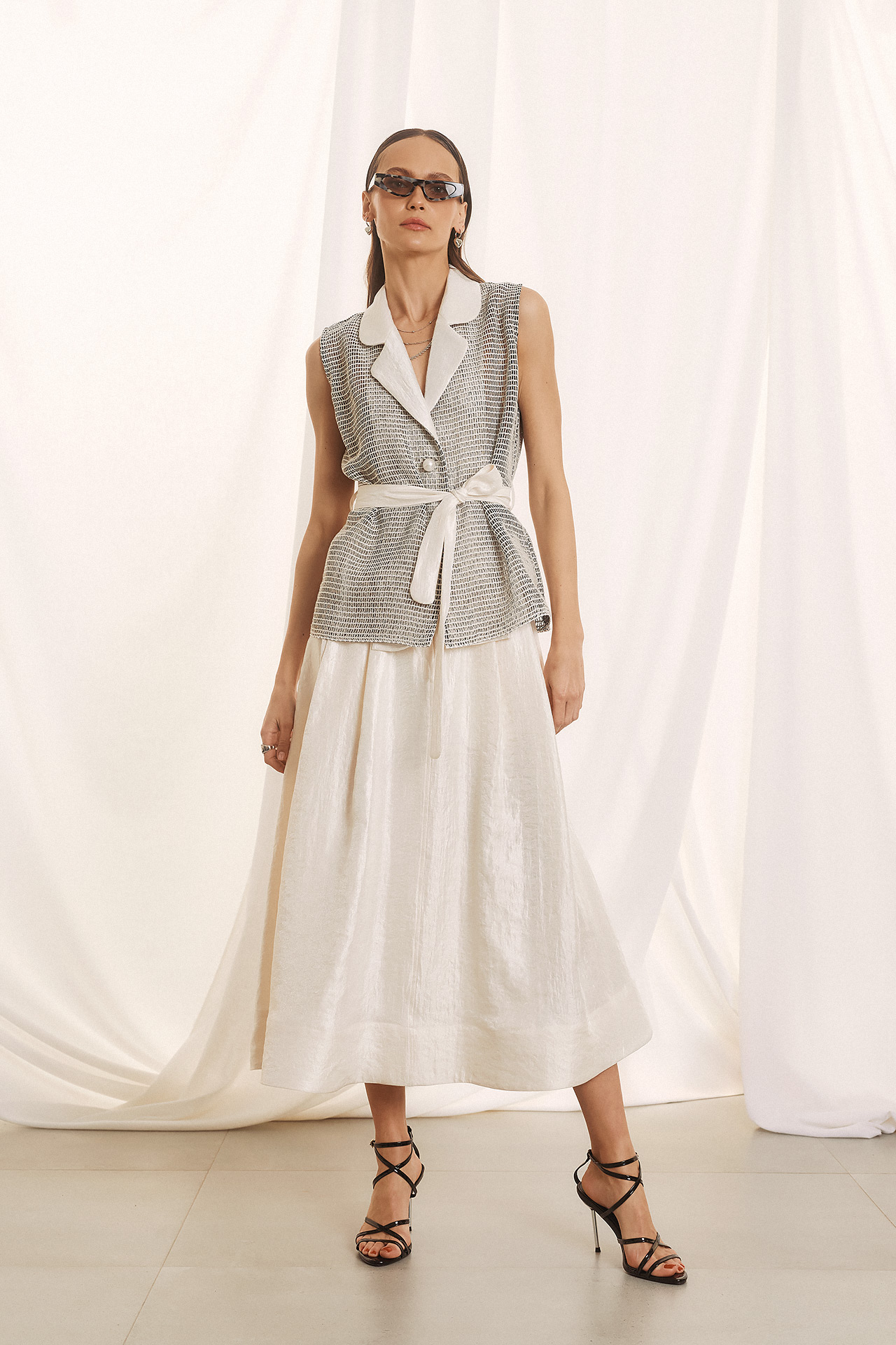Αυτό το κομμάτι είναι ο απόλυτος ορισμός του σύγχρονου design. Δεν είναι απλώς ένα γιλέκο ή μια μπλούζα, αλλά ένα πολυμορφικό statement piece που συνδυάζει αριστοτεχνικά διαφορετικές υφές. Το Ύφασμα το επάνω μέρος είναι κατασκευασμένο από ένα εκλεπτυσμένο δίχτυ (mesh) σε ασπρόμαυρη διχρωμία, που χαρίζει διαφάνεια και αέρινη αίσθηση. Το πέτο και η εσωτερική πλευρά είναι επενδυμένα με το πολυτελές, “κρυσταλιζέ” (shimmer) ύφασμα σε pearl white απόχρωση, το ίδιο με το παντελόνι του σετ. Σε γραμμή αμάνικου blazer, κλείνει με ένα κομψό μαργαριταρένιο κουμπί και σφίγγει στη μέση με μια φαρδιά, satin-finish ζώνη, τονίζοντας τη σιλουέτα με έναν wrap σχεδιασμό.