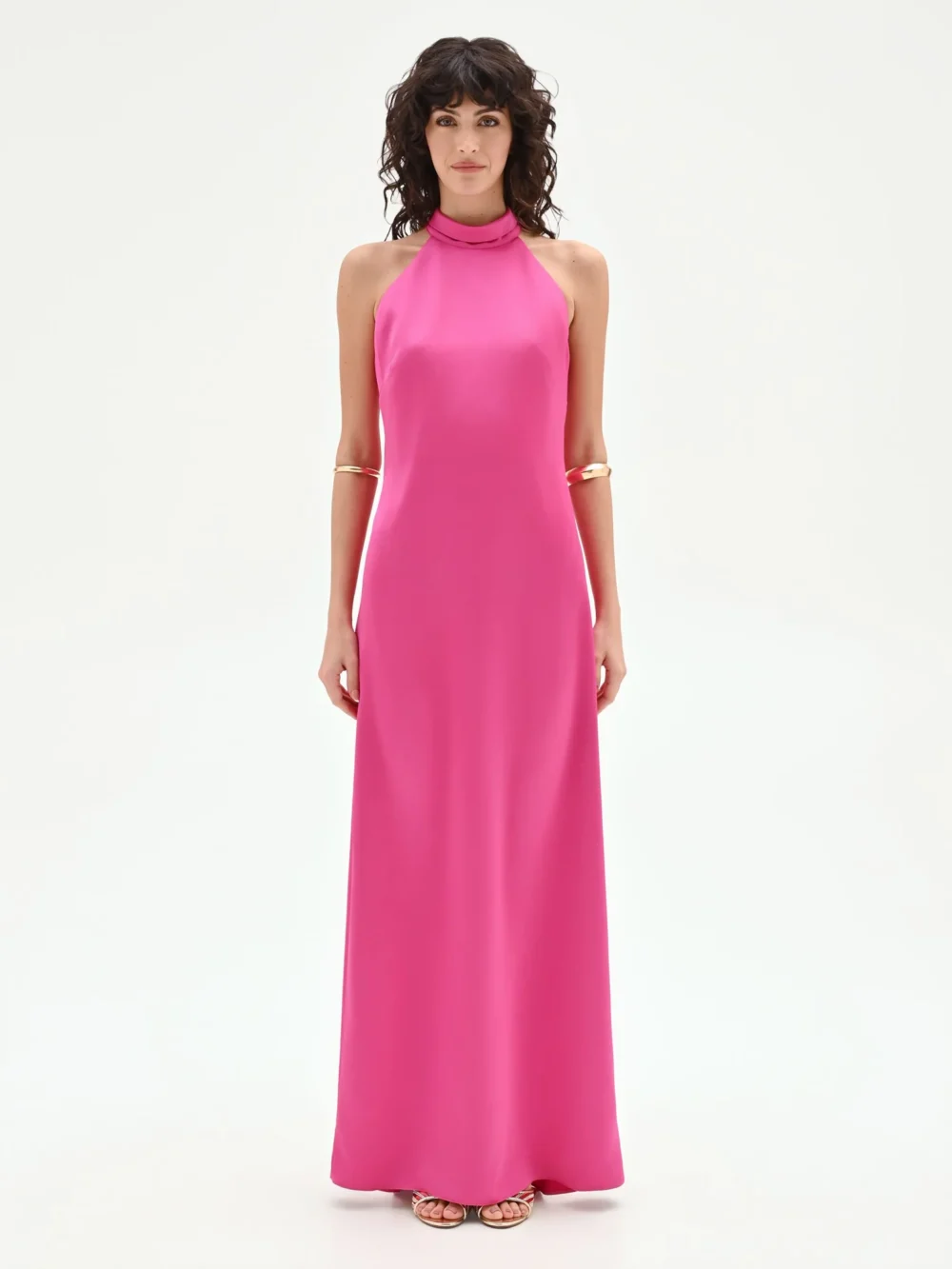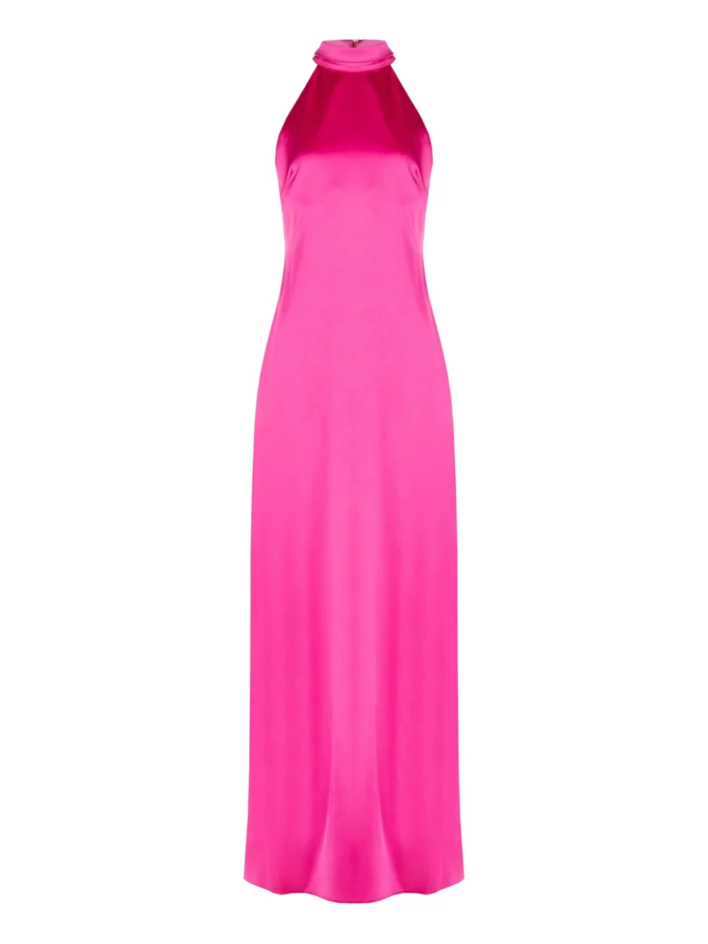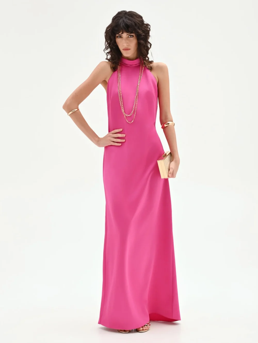 Μια έντονη φούξια απόχρωση χαρακτηρίζει αυτό το σατέν μάξι φόρεμα, ένα αναμφισβήτητα θηλυκό κομμάτι σχεδιασμένο για τις πιο ξεχωριστές περιστάσεις. Η ρευστή, ίσια σιλουέτα του αγκαλιάζει με χάρη το σώμα, καταλήγοντας σε μια εκλεπτυσμένη λαιμόκοψη που αφήνει τους ώμους γυμνούς και κολακεύει τη σιλουέτα. Ο καθαρός σχεδιασμός του διατηρείται από ένα κλείσιμο στην πλάτη, εξασφαλίζοντας τέλεια εφαρμογή χωρίς να διαταράσσει την αρμονική σιλουέτα. Ιδανικό ως φόρεμα για τις θερμότερες μέρες ή για μια γκαλά βραδιά, ολοκληρώστε την εμφάνιση με ψηλοτάκουνα σανδάλια και εντυπωσιακά αξεσουάρ για να ενισχύσετε τον χαρακτήρα του. Το ένδυμα είναι κατασκευασμένο στην Ιταλία