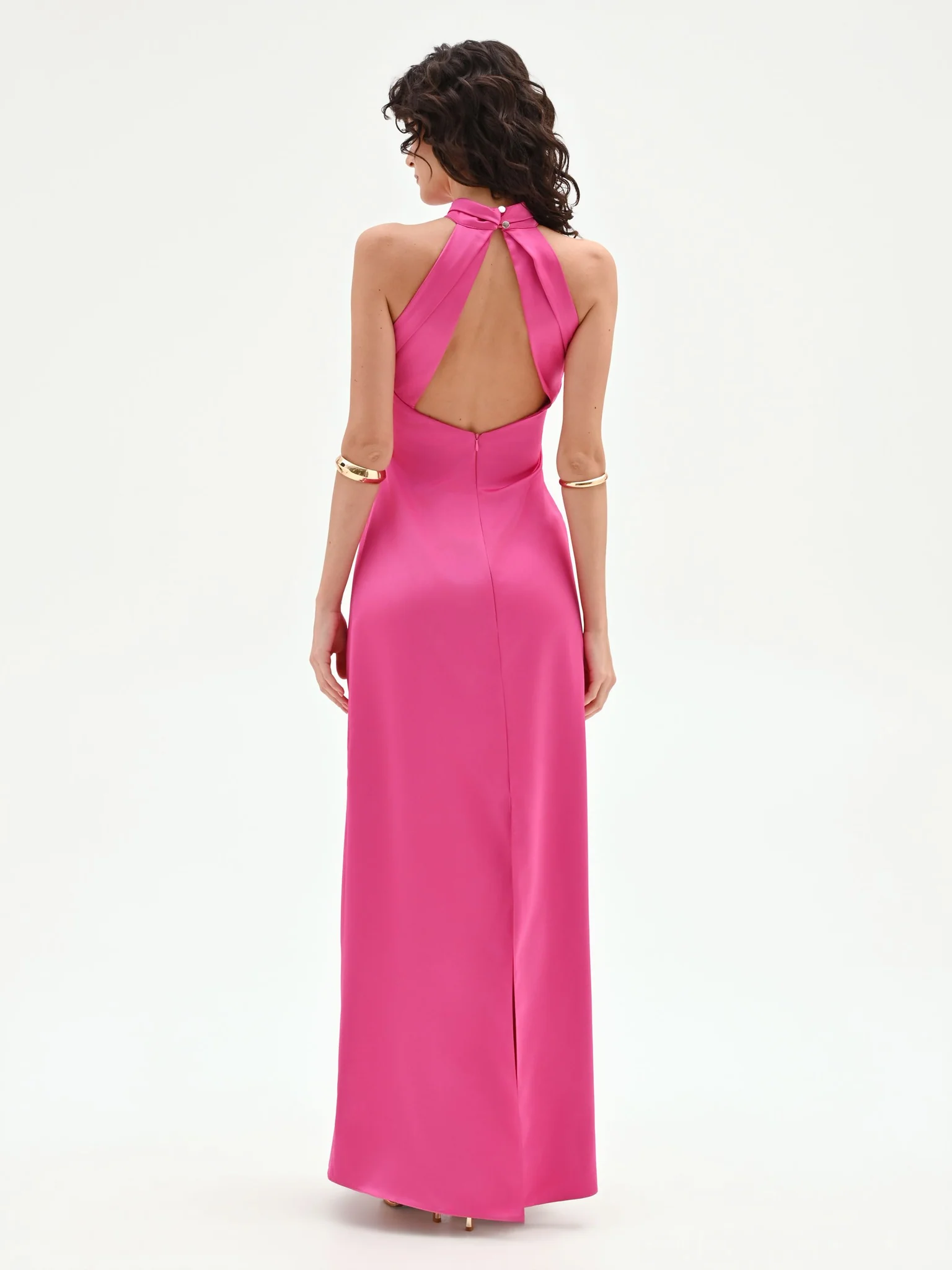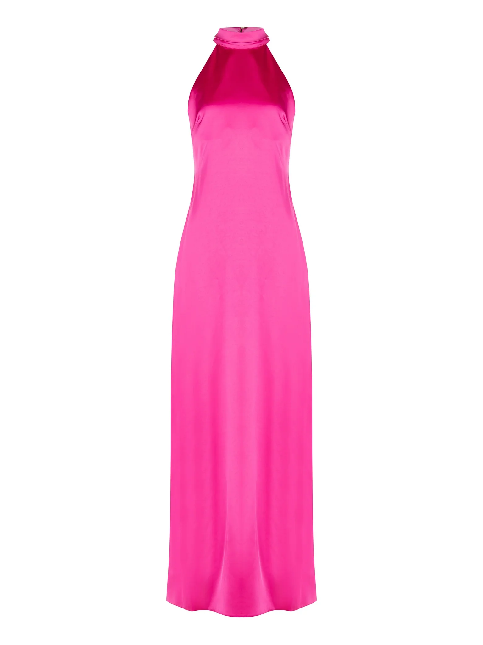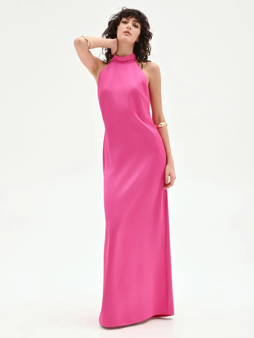 Μια έντονη φούξια απόχρωση χαρακτηρίζει αυτό το σατέν μάξι φόρεμα, ένα αναμφισβήτητα θηλυκό κομμάτι σχεδιασμένο για τις πιο ξεχωριστές περιστάσεις. Η ρευστή, ίσια σιλουέτα του αγκαλιάζει με χάρη το σώμα, καταλήγοντας σε μια εκλεπτυσμένη λαιμόκοψη που αφήνει τους ώμους γυμνούς και κολακεύει τη σιλουέτα. Ο καθαρός σχεδιασμός του διατηρείται από ένα κλείσιμο στην πλάτη, εξασφαλίζοντας τέλεια εφαρμογή χωρίς να διαταράσσει την αρμονική σιλουέτα. Ιδανικό ως φόρεμα για τις θερμότερες μέρες ή για μια γκαλά βραδιά, ολοκληρώστε την εμφάνιση με ψηλοτάκουνα σανδάλια και εντυπωσιακά αξεσουάρ για να ενισχύσετε τον χαρακτήρα του. Το ένδυμα είναι κατασκευασμένο στην Ιταλία