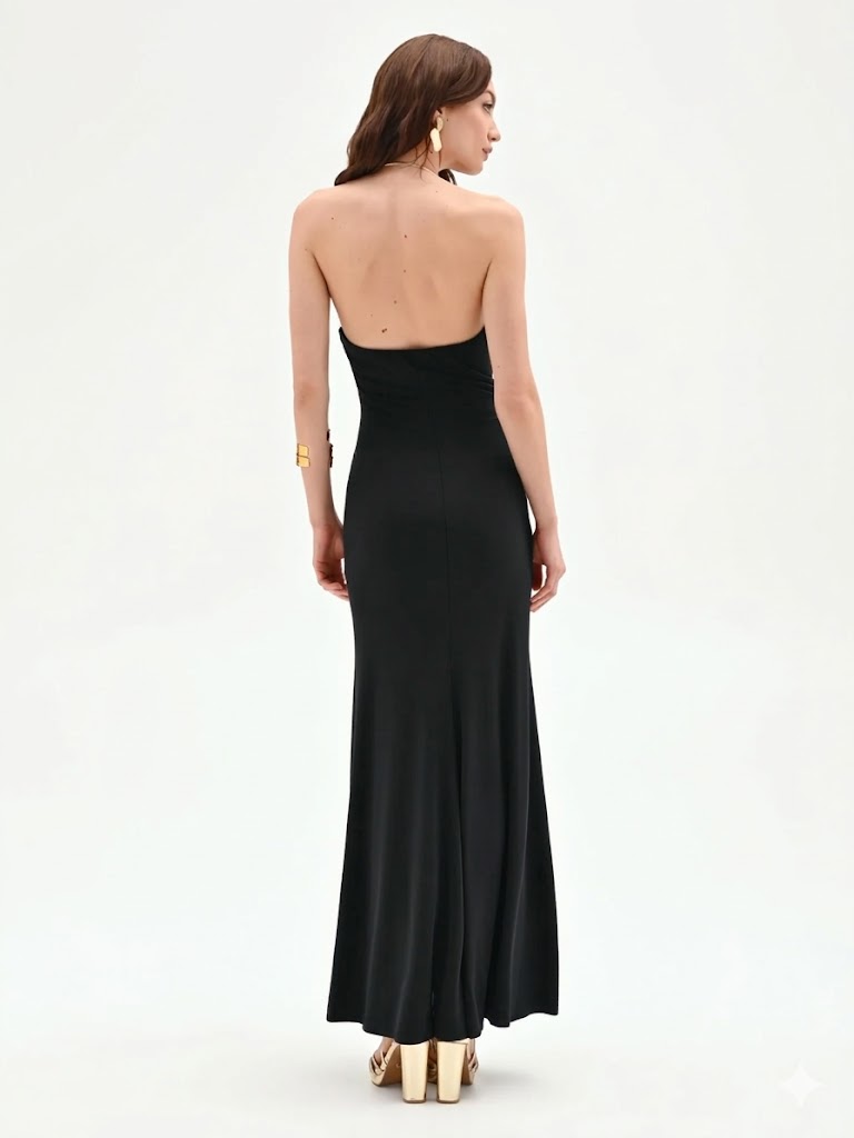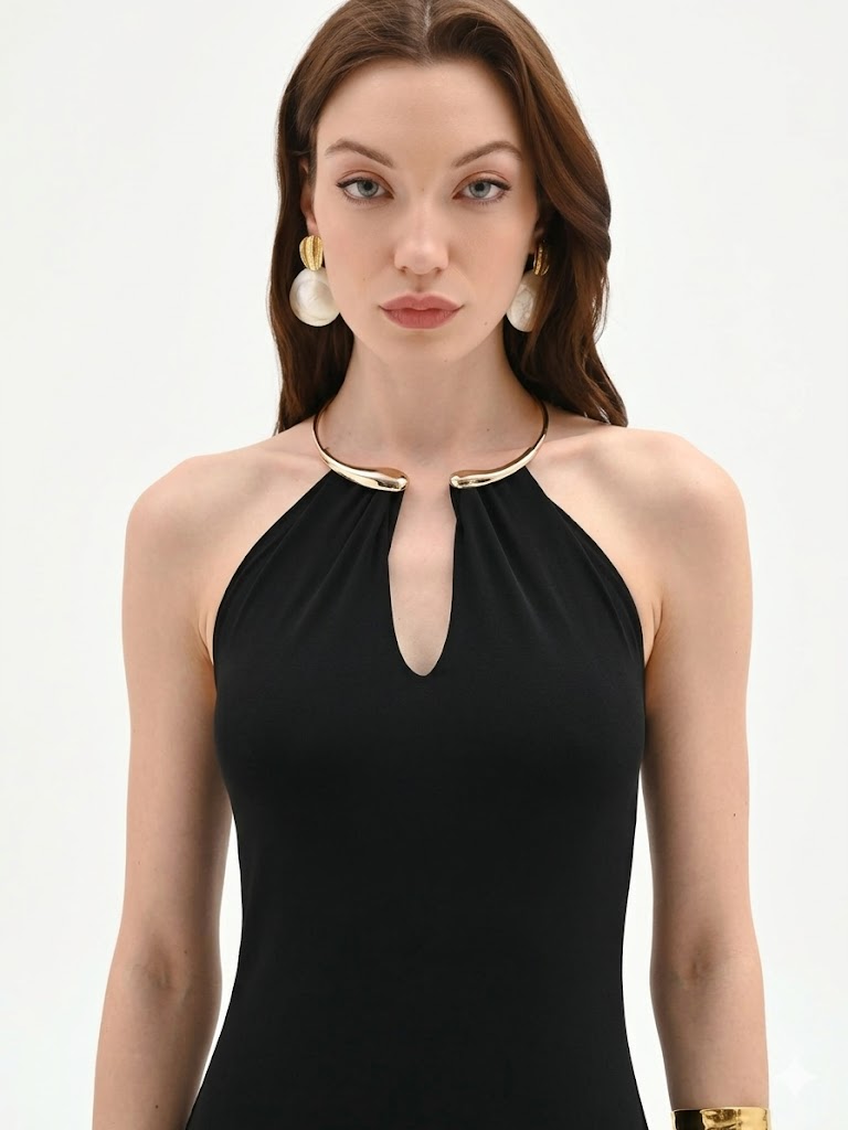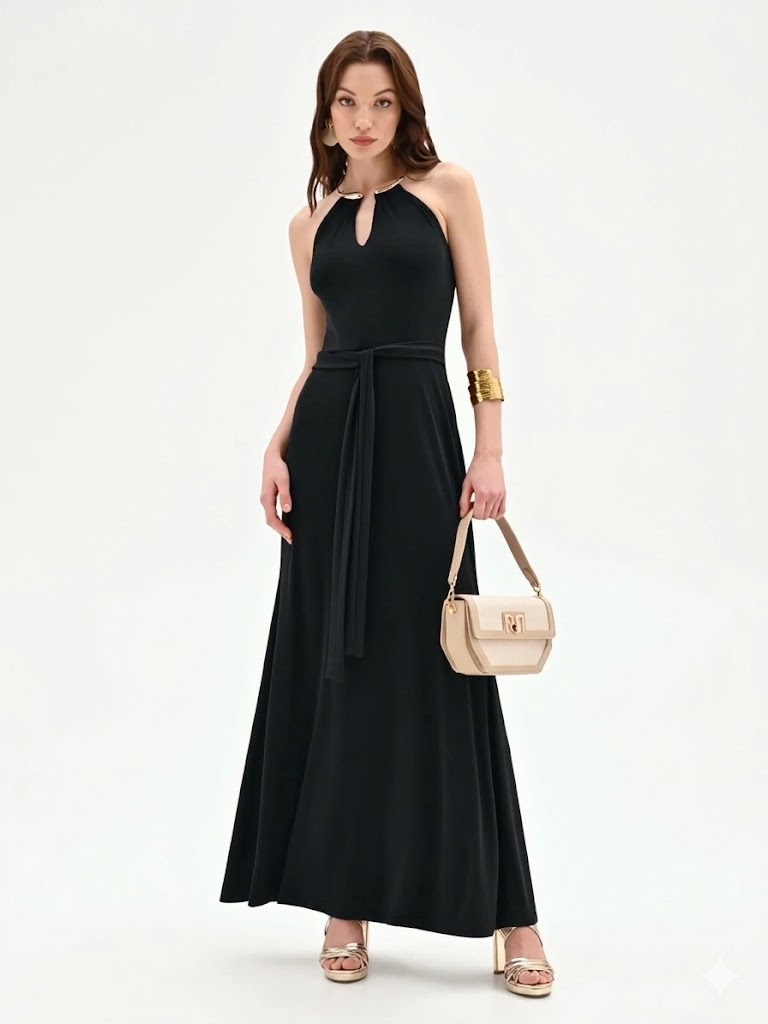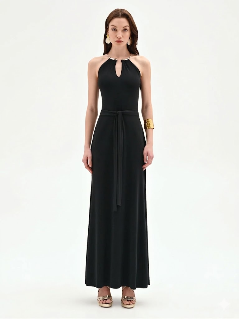 Η κομψότητα και η ρευστότητα συνδυάζονται σε αυτό το μάξι φόρεμα σε σοκολατί απόχρωση, ένα κομμάτι σχεδιασμένο για να φωτίζει τις πιο ξεχωριστές περιστάσεις με σύγχρονη θηλυκότητα. Κατασκευασμένο από ελαφρύ ζέρσεϊ, το σχέδιο ενισχύεται από ένα ντεκολτέ που κλείνει με halter και σχηματίζει μια χρυσή λεπτομέρεια γιακά, δημιουργώντας ένα λεπτό ρέλι στο ντεκολτέ και αποκαλύπτοντας ένα αισθησιακό άνοιγμα με τρύπα. Η σιλουέτα έχει σχεδιαστεί για να ακουμπάει απαλά το σώμα, ακολουθώντας τις καμπύλες του χωρίς περιορισμούς, ενώ η φούστα πέφτει απαλά στους αστραγάλους με φυσική ροή. Η μέση ορίζεται από μια ασορτί υφασμάτινη ζώνη, επιτρέποντάς σας να προσαρμόσετε την εφαρμογή με έναν απαλό κόμπο. Ιδανικό για επίσημες εκδηλώσεις ή μια κομψή βραδινή έξοδο, αυτό το φόρεμα αποπνέει εκλεπτυσμένο στυλ. Ολοκληρώστε την εμφάνιση με αξεσουάρ σε χρυσή απόχρωση που αντανακλούν τη λεπτομέρεια του γιακά, για ένα αρμονικό και λαμπερό σύνολο.