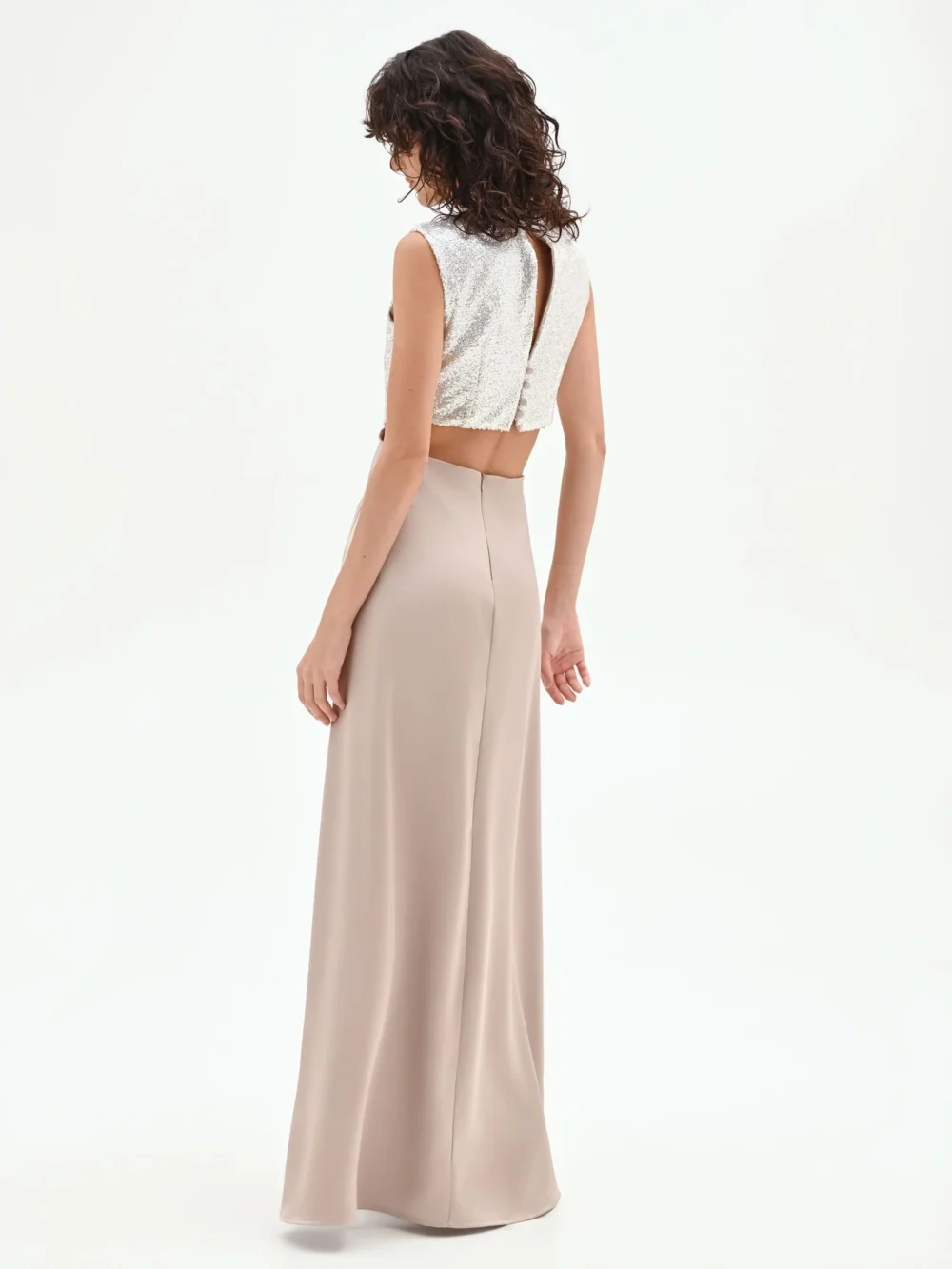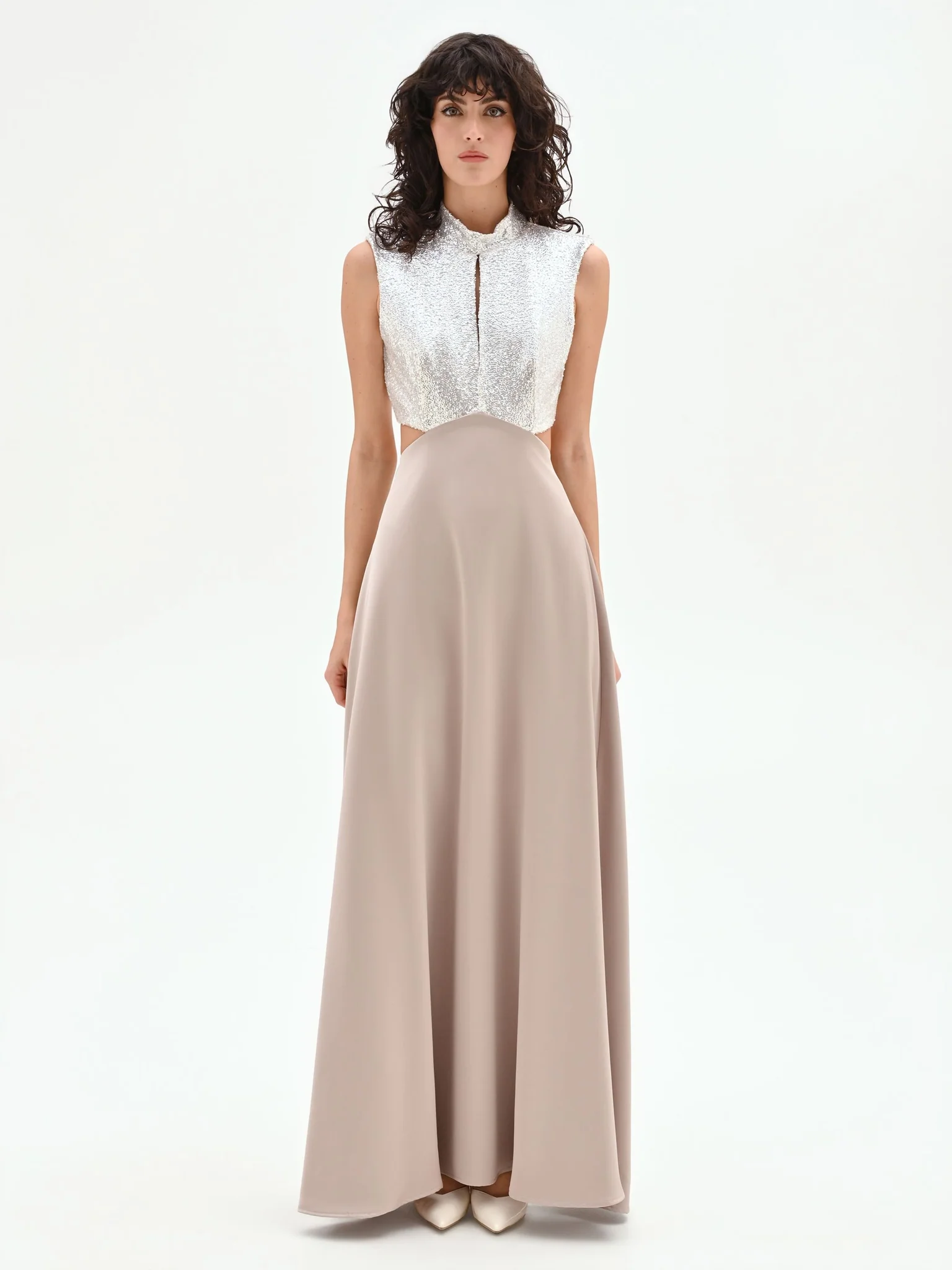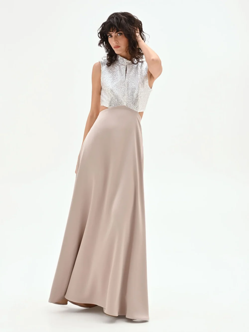 Η πραγματική έκπληξη του στυλ είναι τα φαρδιά πλαϊνά ανοίγματα που αφήνουν τη μέση εκτεθειμένη, συνδέοντας τολμηρά το πάνω μέρος με τη μακριά φούστα. Κατασκευασμένη από ένα λείο, ρευστό μπεζ ύφασμα, η φούστα γλιστράει ελαφρά στο πάτωμα, δημιουργώντας μια λεπτή και εκλεπτυσμένη σιλουέτα. Με πρακτικό κλείσιμο πίσω, αυτό το φόρεμα είναι η ιδανική επιλογή για μια τελετή ή μια γκαλά βραδιά. Για μια αξέχαστη εμφάνιση, συνδυάστε το με ιδιαίτερα αξεσουάρ από τη συλλογή.