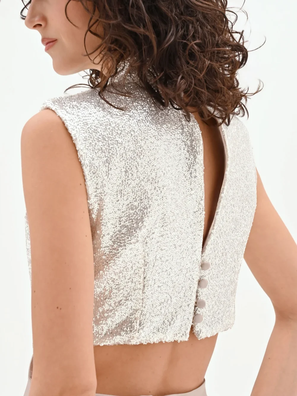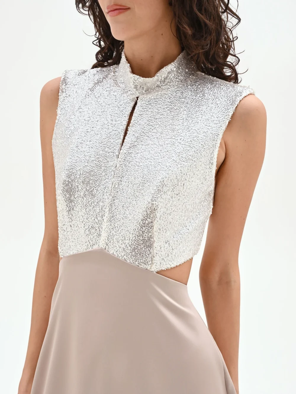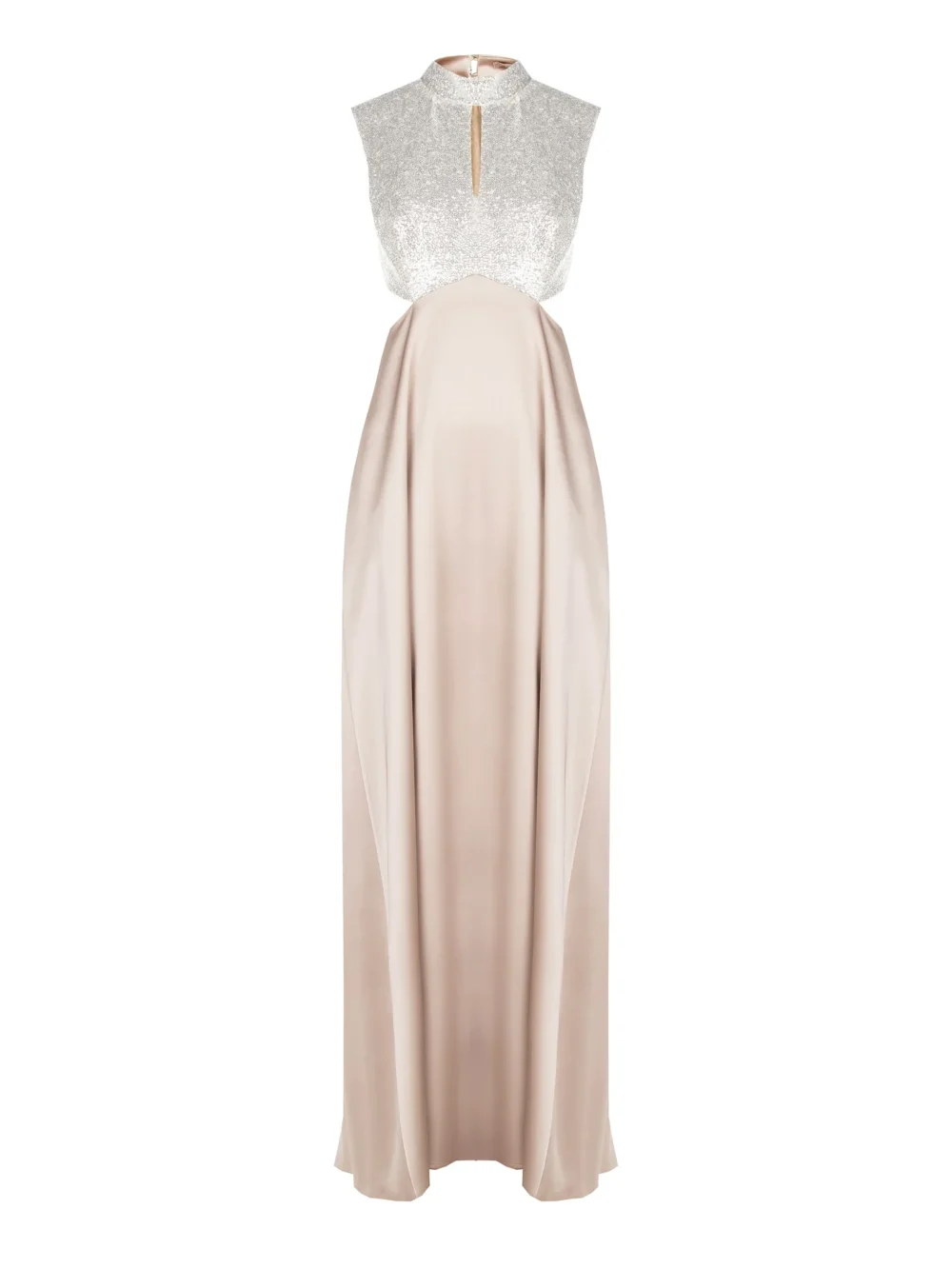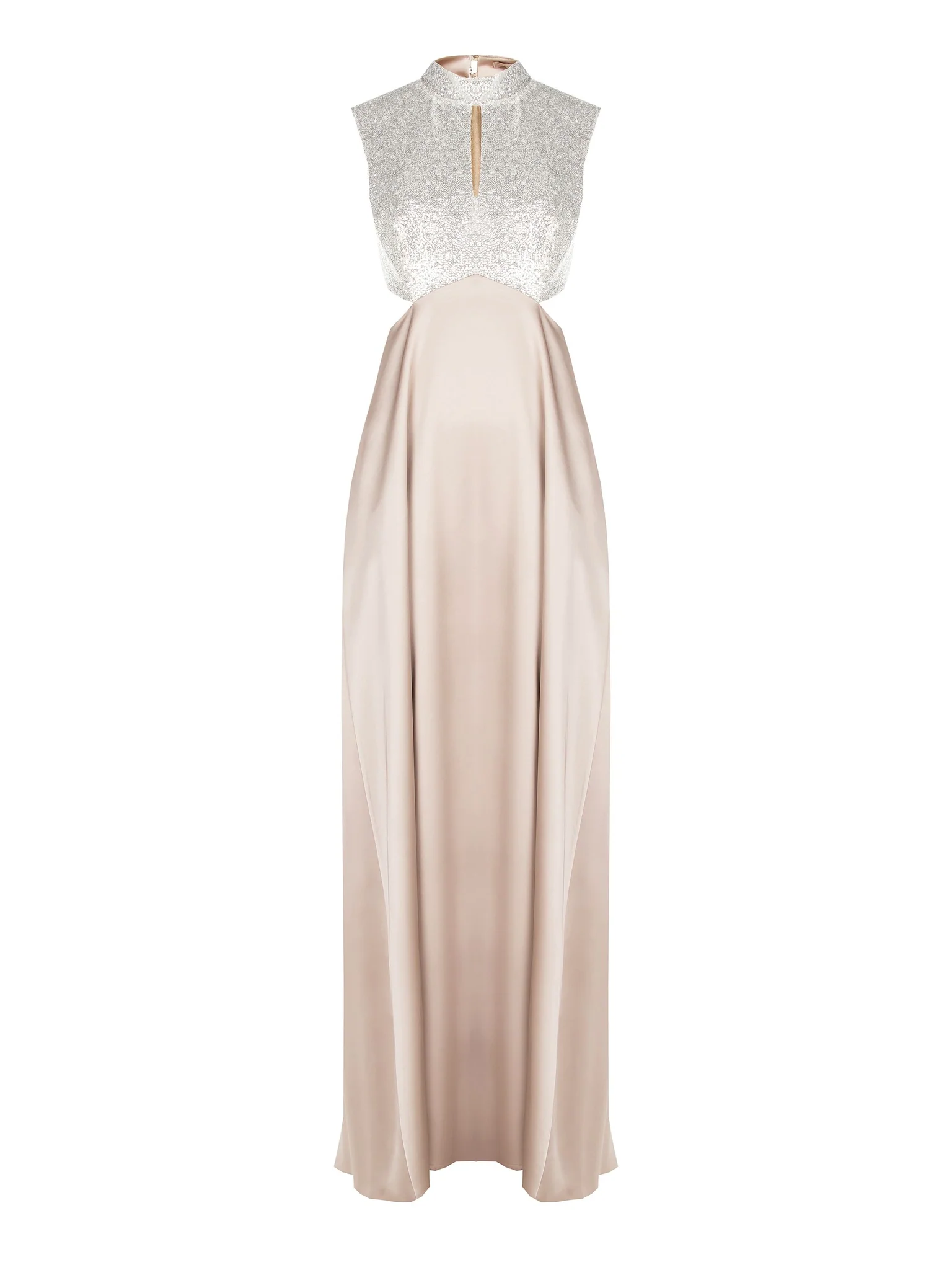 Μια εκλεπτυσμένη αλληλεπίδραση μεταξύ φωτός και υφής καθορίζει το σχέδιο αυτού του μακριού φορέματος, μιας δημιουργίας μεικτών μέσων που σχεδιάστηκε για να φωτίσει τις πιο ξεχωριστές βραδιές και εκδηλώσεις. Το αμάνικο μπούστο τραβάει την προσοχή με το πυκνό κέντημα με παγιέτες, δημιουργώντας ασημένιες αντανακλάσεις με κάθε κίνηση. Το σχέδιο ολοκληρώνεται από έναν κομψό όρθιο γιακά, με ένα διακριτικό άνοιγμα κλειδαρότρυπας στο κέντρο του ντεκολτέ που προσθέτει μια πινελιά διακριτικής θηλυκότητας.
