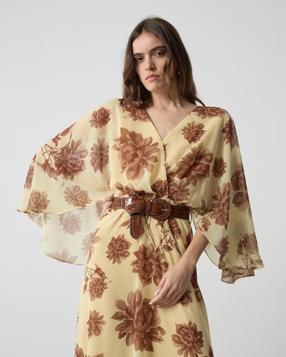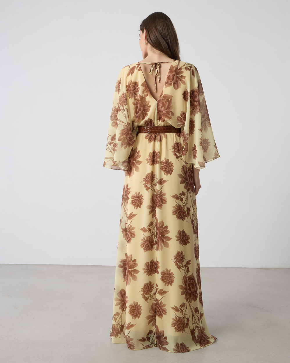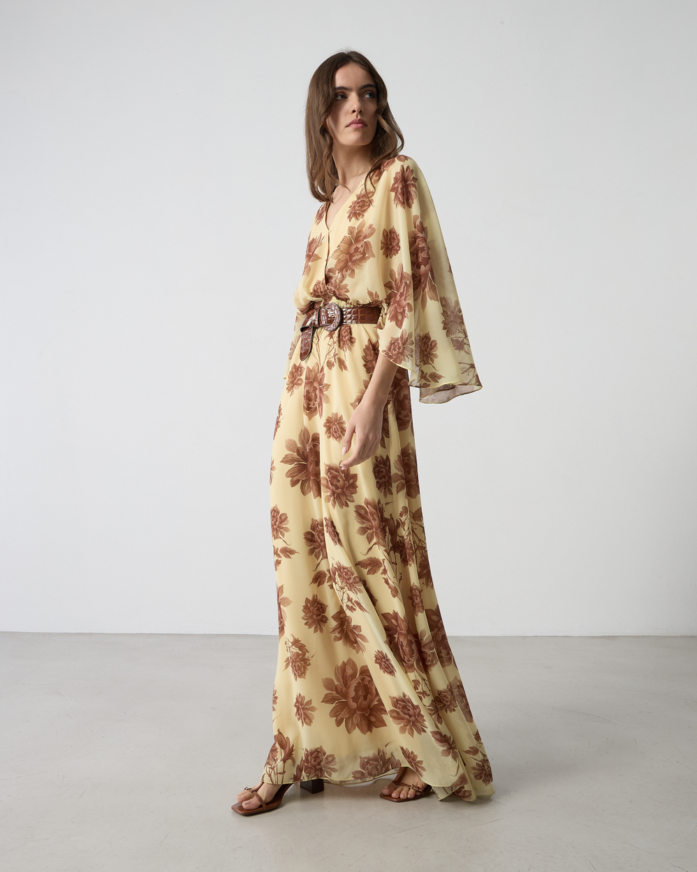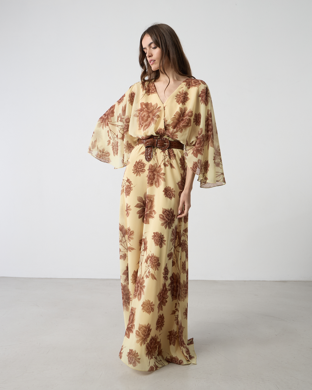 Φόρεμα maxi φλοράλ με V λαιμόκοψη, φαρδιά αέρινα μανίκια με αποσπώμενη ζώνη, σε κανονική εφαρμογή