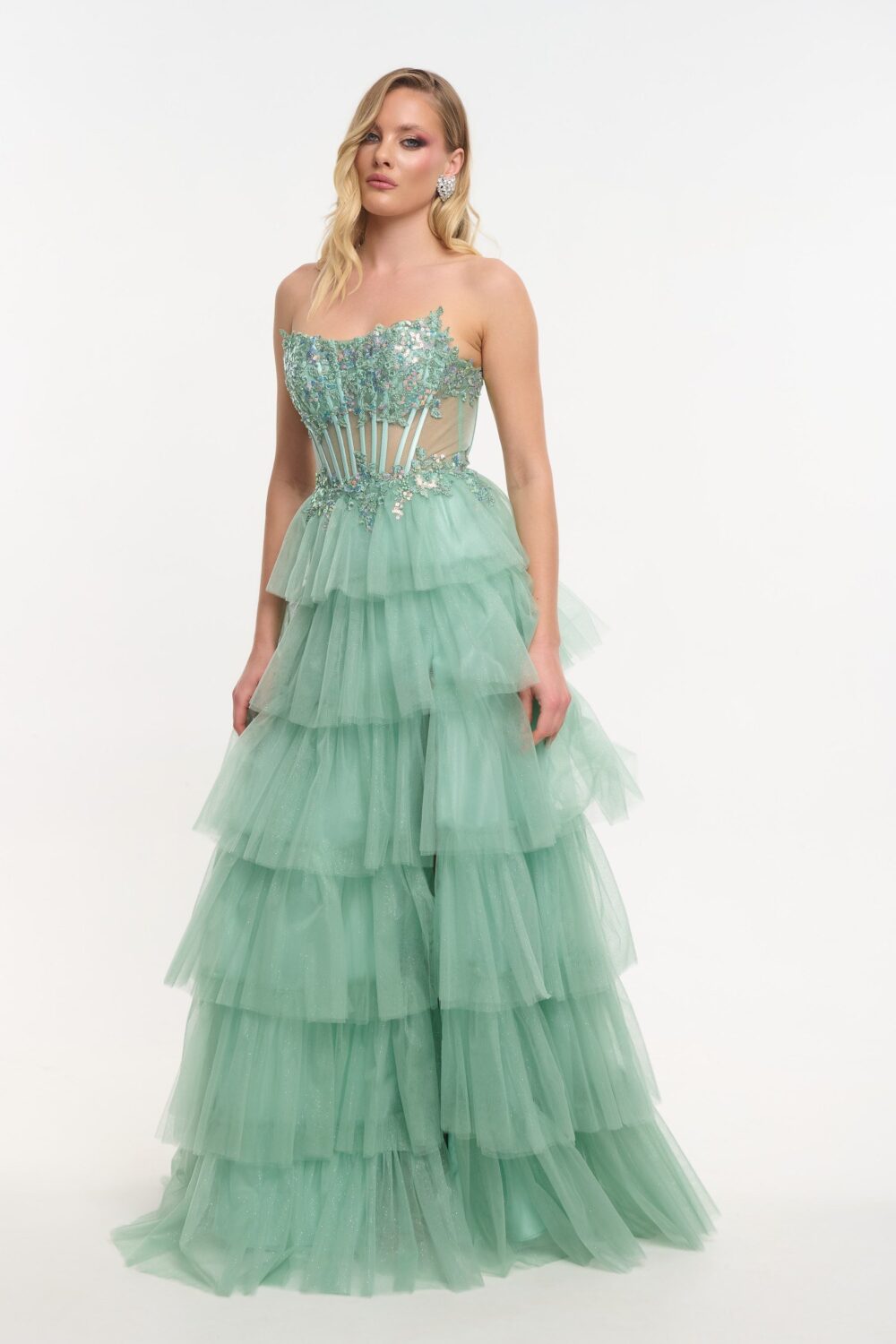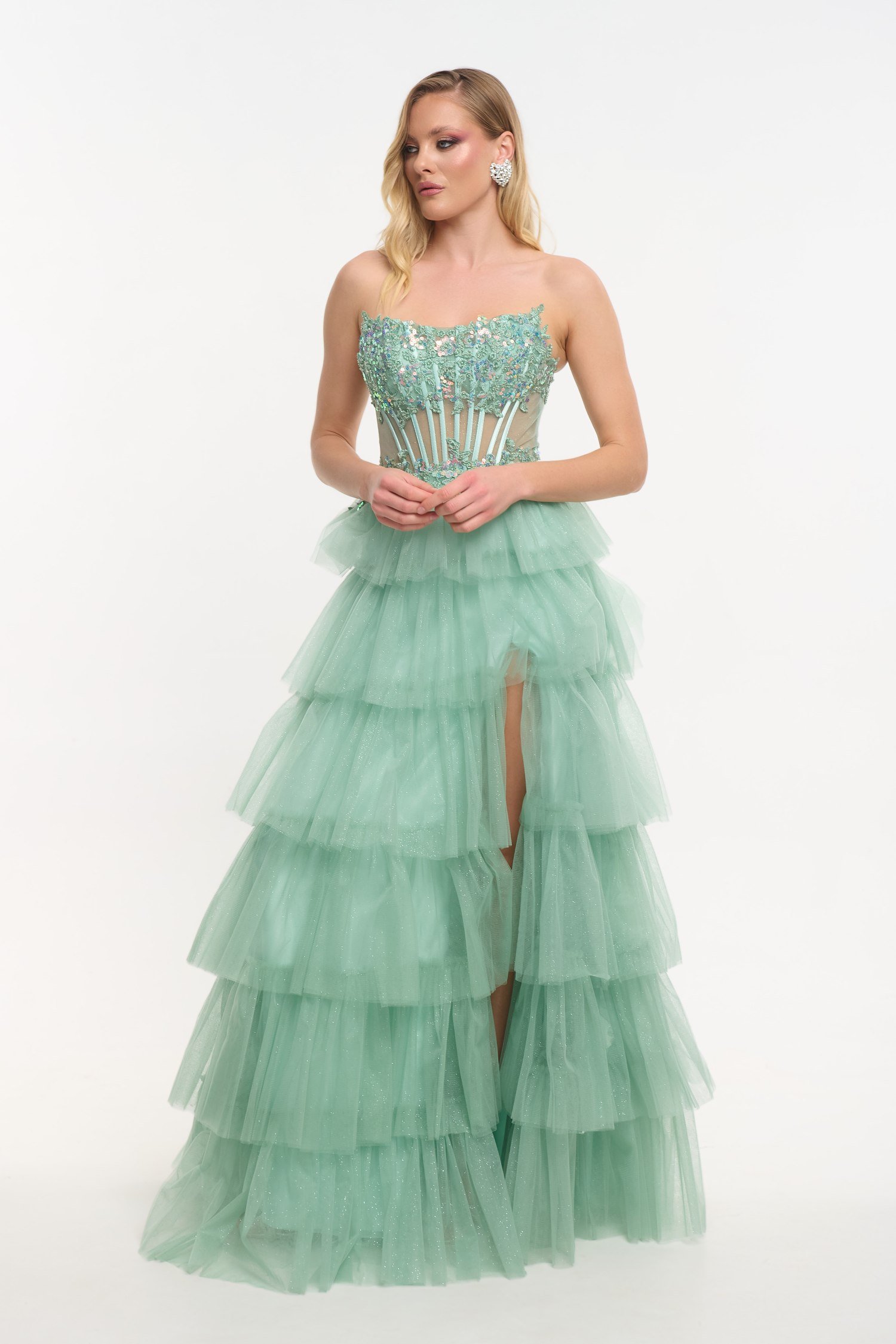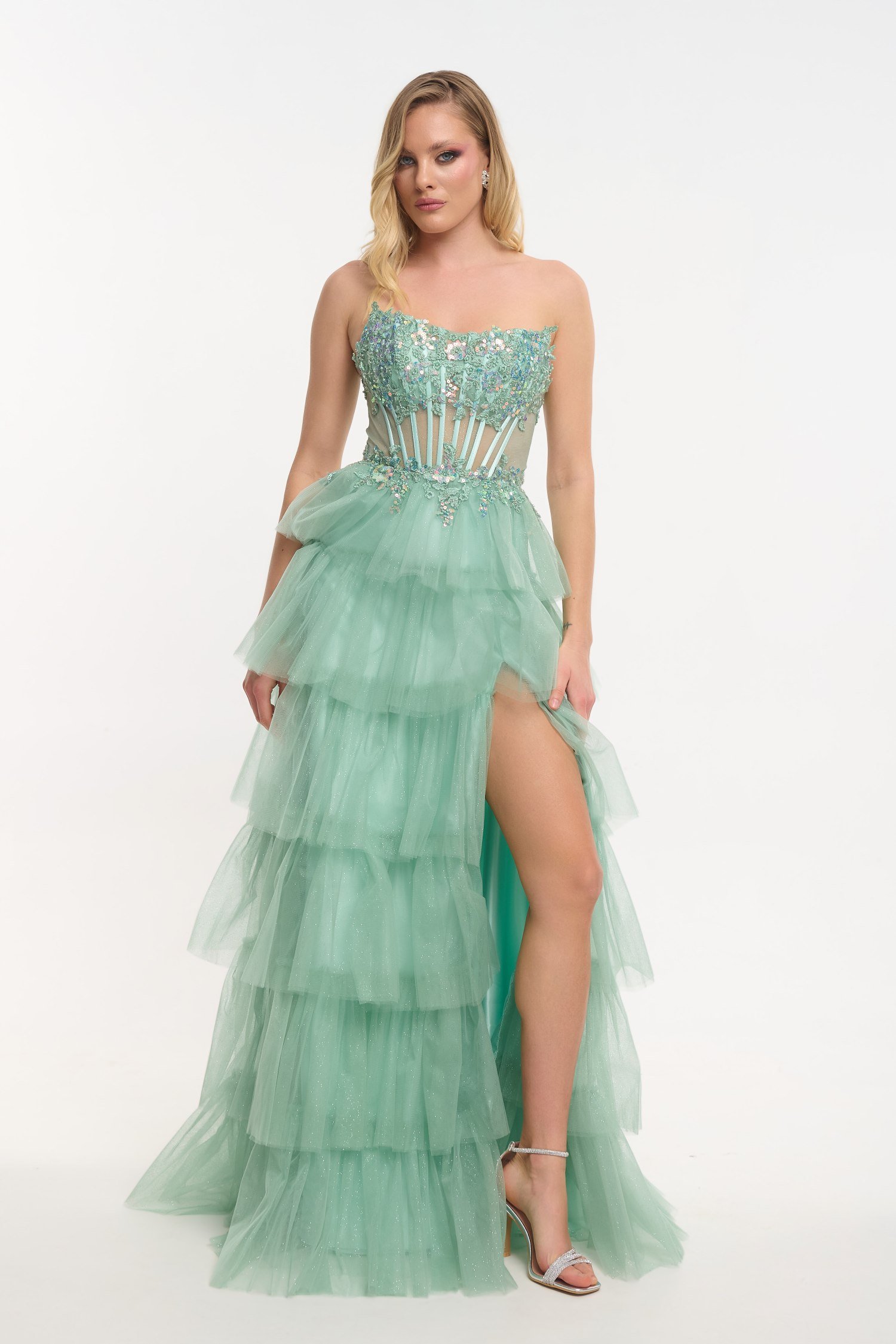 Εντυπωσιακό τούλινο φόρεμα μακρύ, σε απαλή μέντα, με glitter σε όλη του την επιφάνεια. Είναι strapless με κεντημένο μπούστο και διακόσμηση με πέρλες και πούλιες. Η φούστα του είναι τύπου τούρτα και έχει άνοιγμα στα πόδια. Δένει με κορδόνια στην πλάτη και κλείνει με φερμουάρ.