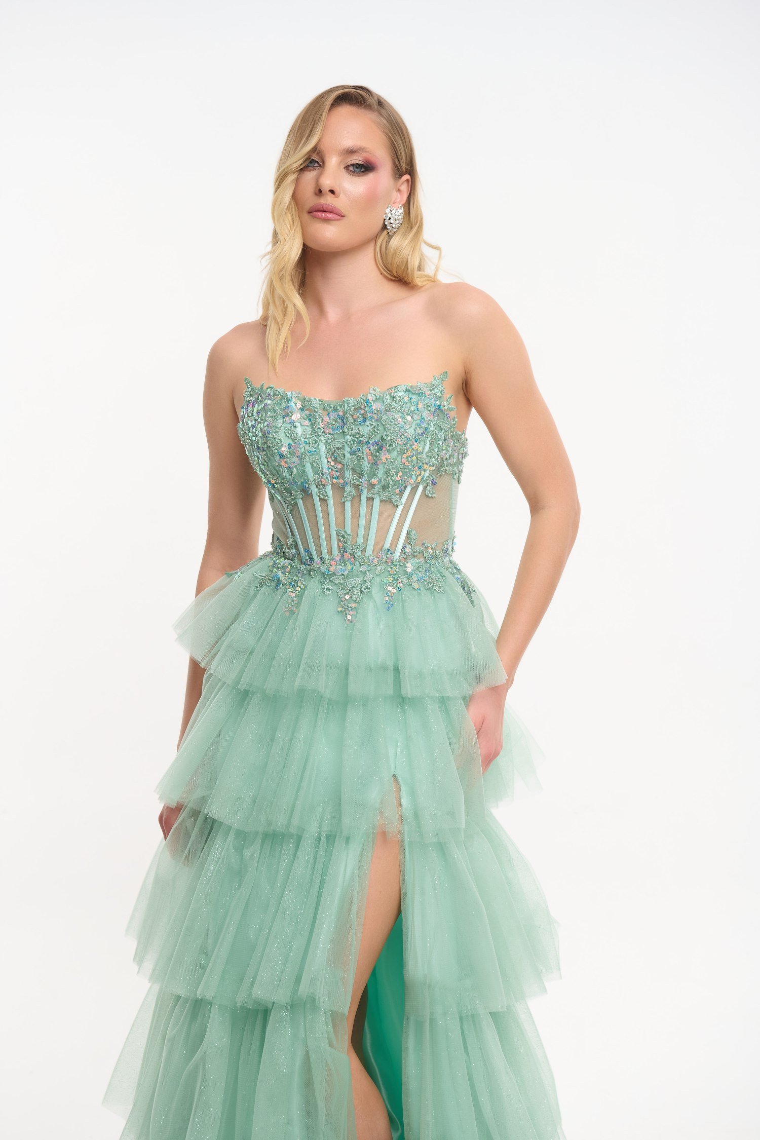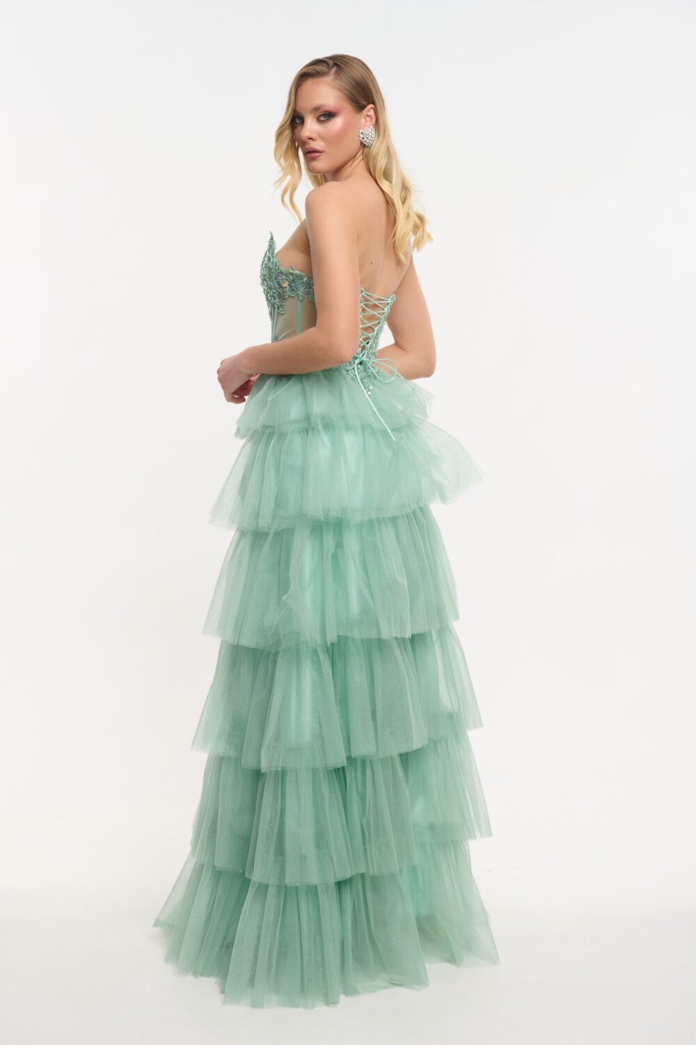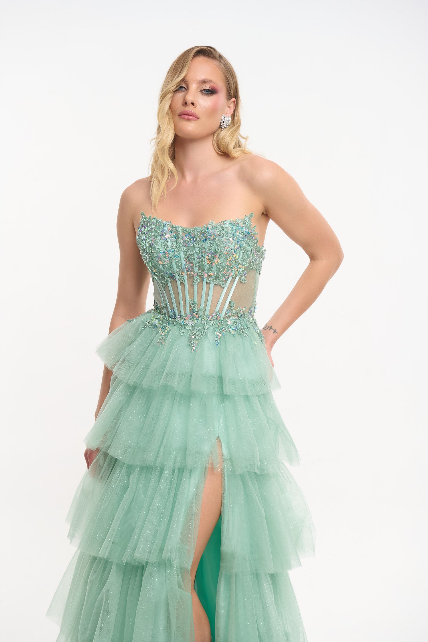 Εντυπωσιακό τούλινο φόρεμα μακρύ, σε απαλή μέντα, με glitter σε όλη του την επιφάνεια. Είναι strapless με κεντημένο μπούστο και διακόσμηση με πέρλες και πούλιες. Η φούστα του είναι τύπου τούρτα και έχει άνοιγμα στα πόδια. Δένει με κορδόνια στην πλάτη και κλείνει με φερμουάρ.