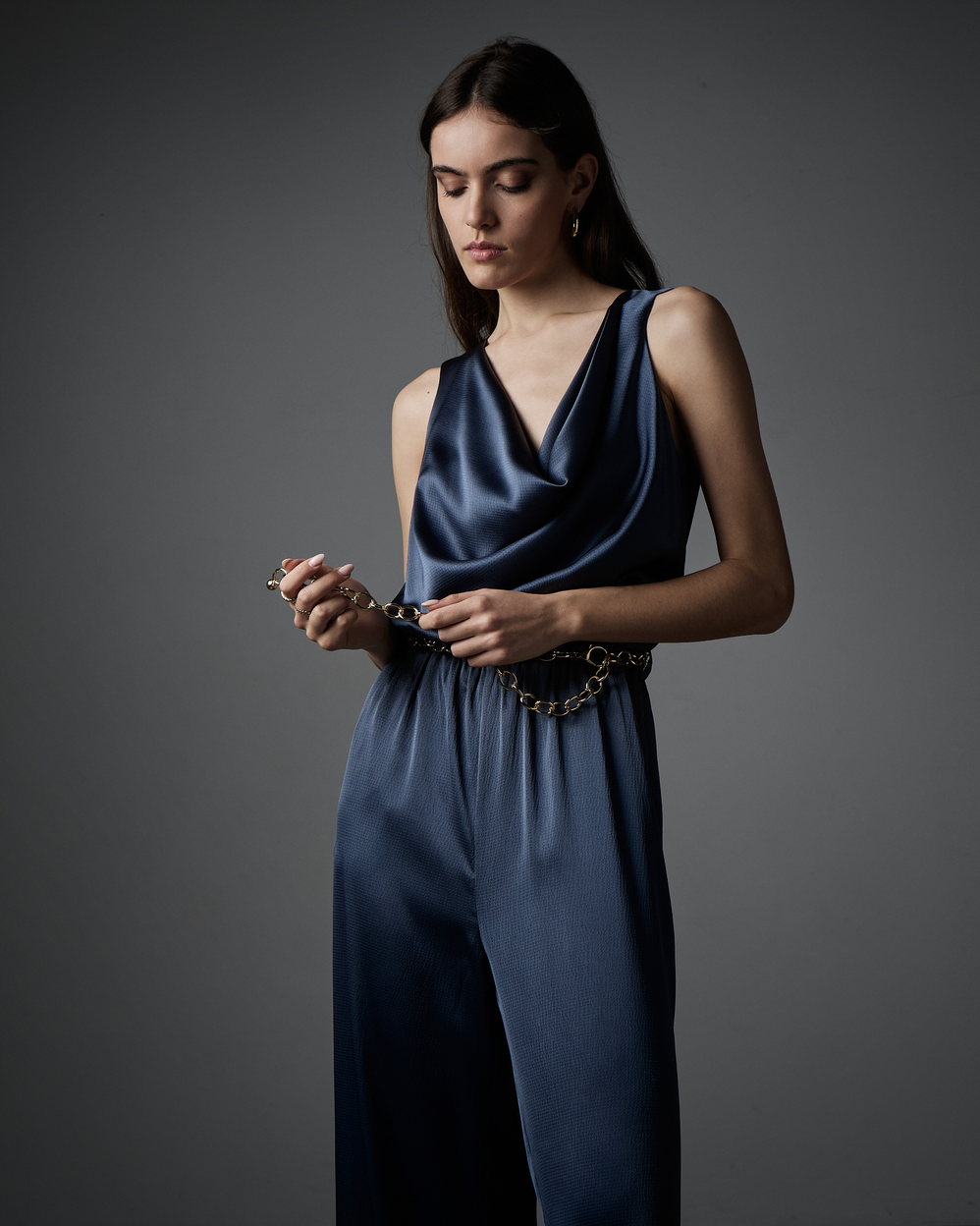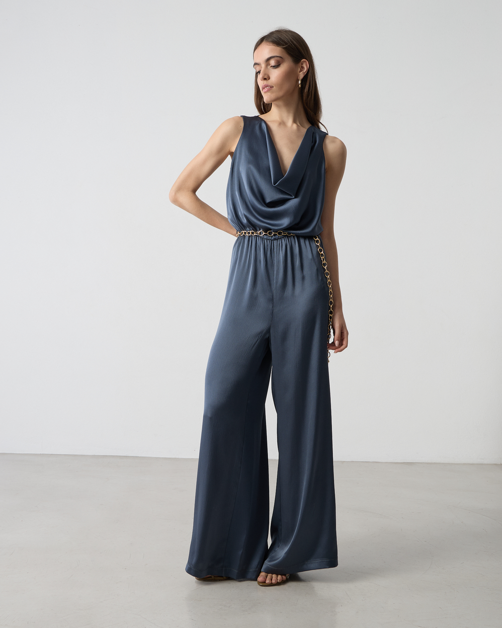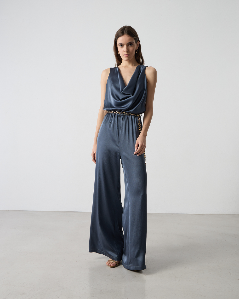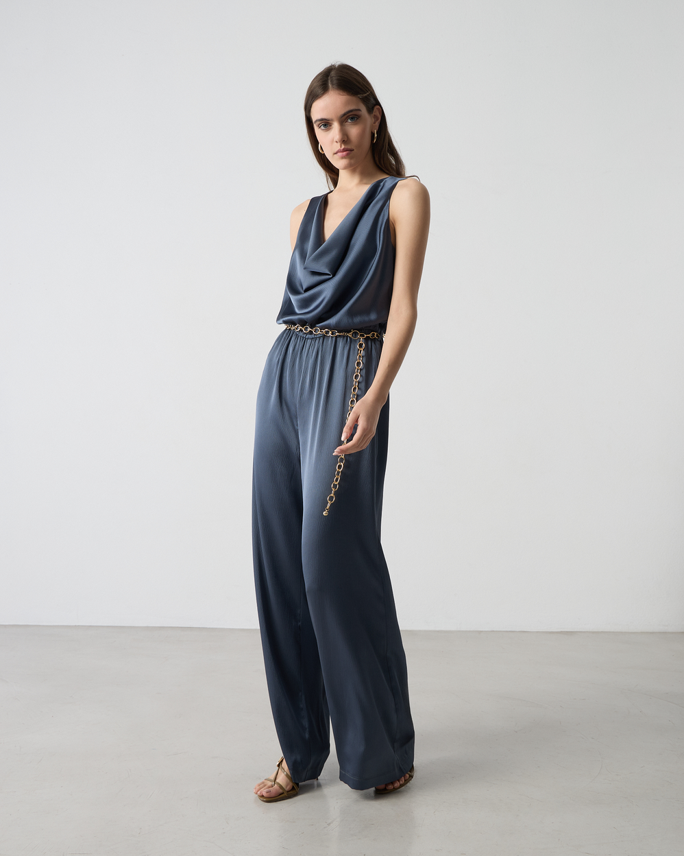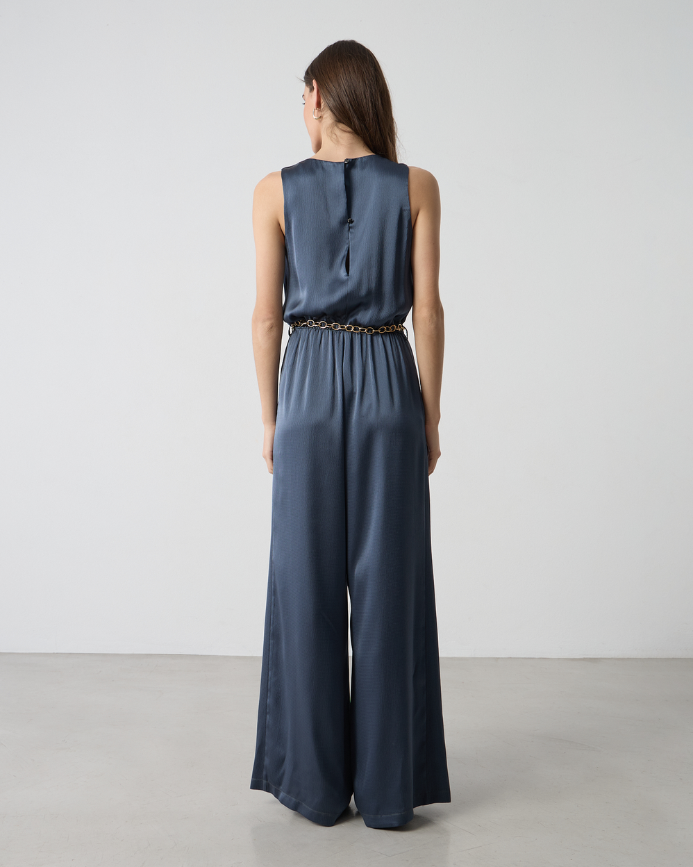 Φόρμα ολόσωμη αμάνικη με ντραπέ ντεκολτέ, διακοσμητική μεταλλική αλυσίδα στη μέση, κλείσιμο με κουμπιά στην πλάτη, σε σατέν υφή, κανονική εφαρμογή.