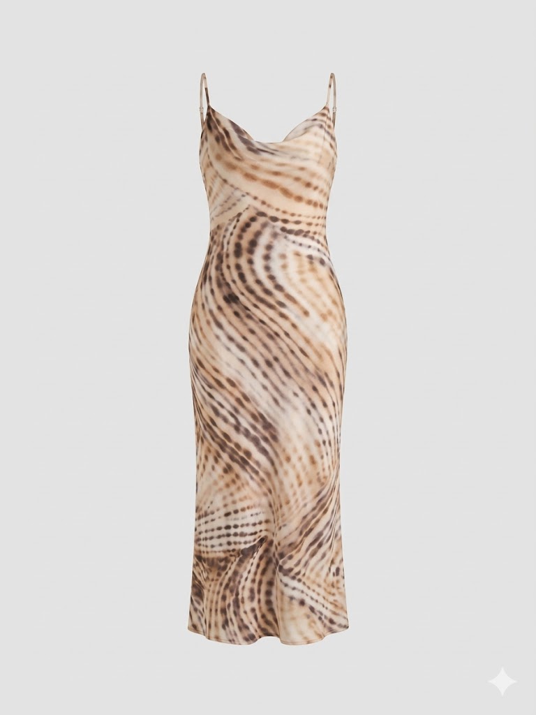 Διαθέτει κομψό cowl neck (χαλαρή λαιμόκοψη) και λεπτές τιράντες που αναδεικνύουν τους ώμους, ενώ η slip γραμμή του αγκαλιάζει απαλά τη σιλουέτα, προσφέροντας κίνηση και άνεση. Το μοναδικό earth-toned tie-dye print σε αποχρώσεις της άμμου και του καφέ δίνει μια high-end αισθητική, κάνοντας κάθε κομμάτι να φαίνεται μοναδικό. Πολυτελές σατινέ φινίρισμα με απαλή λάμψη.