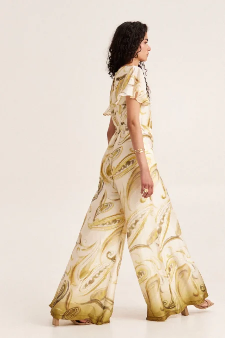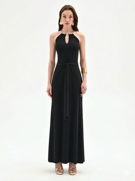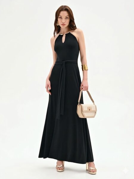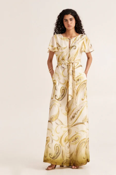 Η πραγματική έκπληξη του στυλ είναι τα φαρδιά πλαϊνά ανοίγματα που αφήνουν τη μέση εκτεθειμένη, συνδέοντας τολμηρά το πάνω μέρος με τη μακριά φούστα. Κατασκευασμένη από ένα λείο, ρευστό μπεζ ύφασμα, η φούστα γλιστράει ελαφρά στο πάτωμα, δημιουργώντας μια λεπτή και εκλεπτυσμένη σιλουέτα. Με πρακτικό κλείσιμο πίσω, αυτό το φόρεμα είναι η ιδανική επιλογή για μια τελετή ή μια γκαλά βραδιά. Για μια αξέχαστη εμφάνιση, συνδυάστε το με ιδιαίτερα αξεσουάρ από τη συλλογή.
