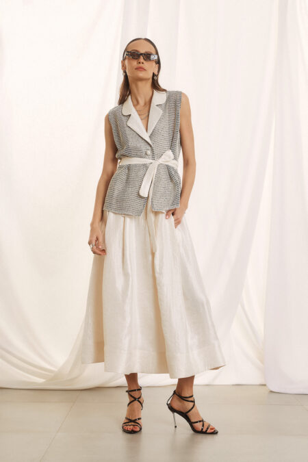 105,00€Αναβαθμίστε το στυλ σας με αυτό το εκλεπτυσμένο αμάνικο γιλέκο, που συνδυάζει την κλασική υφή του tweed με μοντέρνα, θηλυκά στοιχεία. Σχεδιασμένο για να προσφέρει δομή και κομψότητα, αποτελεί το ιδανικό layering κομμάτι για κάθε εποχή.