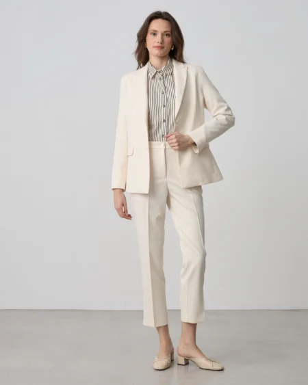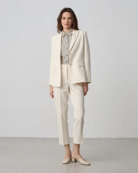 Premium πλέξη σε ασπρόμαυρο μοτίβο (tweed look). Αντίθεση με λευκό πέτο και διακοσμητικό κούμπωμα με πέρλα.